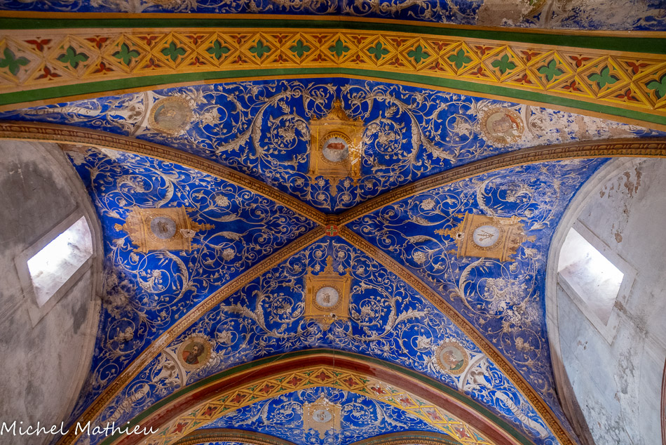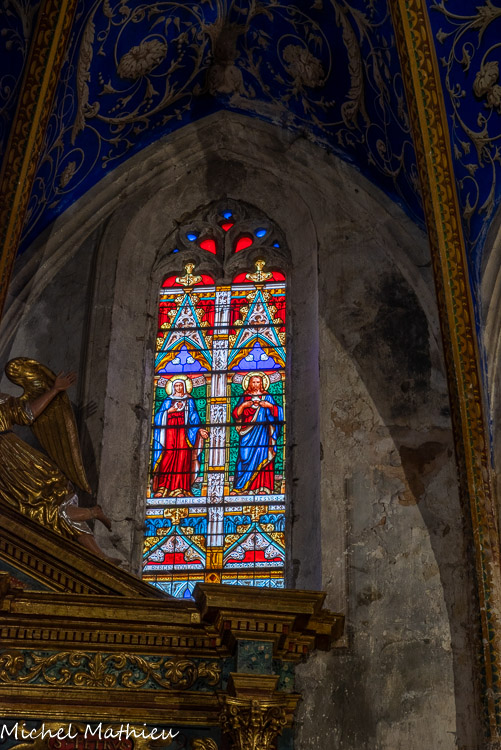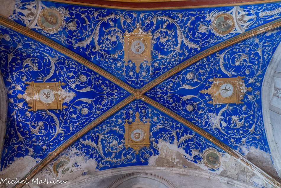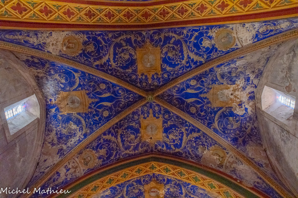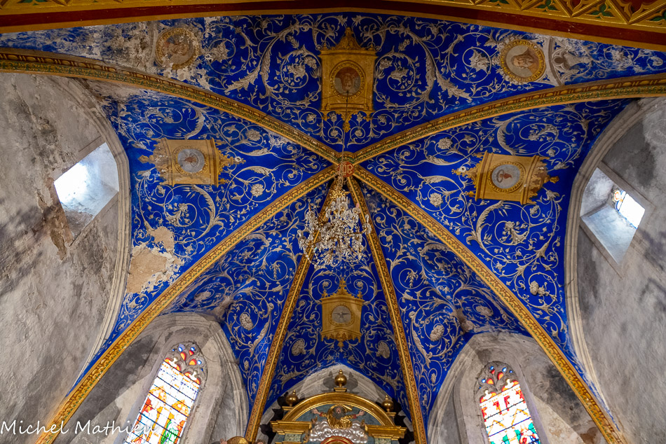 Plafond de la nef. Le plafond a été réalisé par les mêmes artistes que ceux de la cathédrale d’ Albi : même couleurs, même motifs. Cette voûte d’un bleu profond, d’une hauteur de 20m, est