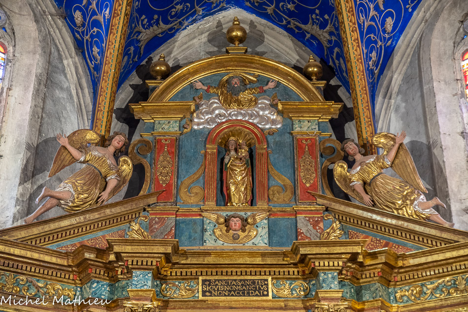 Couronnement : fronton encadré par deux statues d'ange en consoles, et avec une statue de Vierge à l'Enfant dans une niche. La Sainte Vierge au rosaire est encadrée par deux anges à demi couchés et placée au-dessus d’un chérubin. Sous la Sainte Vierge, un cartouche en latin: SAINT, SAINT, SI QUELQU’UN N’EST PAS SANCTIFIE, N ‘APPROCHEZ PAS! L’ensemble est dominé par Dieu le Père apparaissant au-dessus des nuages et bénissant le Monde.