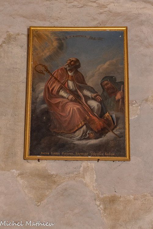 Saint Martin est représenté sur des nuées, le regard tourné vers l'apparition d'une gloire de rayons dorés dans le coin supérieur gauche. Il est vêtu d'une chape et tient la crosse à la main. La mitre est posée à ses pieds. A droite apparaît un homme barbu, appuyé sur un bâton, la tête couverte d'une capuche. Il s'agit peut-être du mendiant avec qui il a partagé son manteau. L'inscription indique que le tableau a été offert par la famille Fanjol-Azemat, une importante famille connue à Puycelsi, pendant la Révolution. 19e siècle.