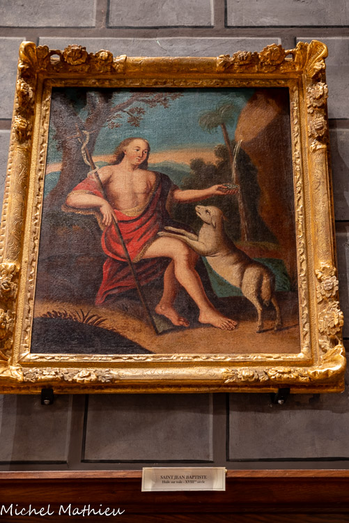 Tableau et son cadre : Saint Jean-Baptiste. Saint Jean-Baptiste est assis, entourant de son bras droit un grand crucifix, et recueillant de la main gauche l'eau d'une cascade. L'agneau pose ses pattes avant sur ses genoux. 18e siècle.