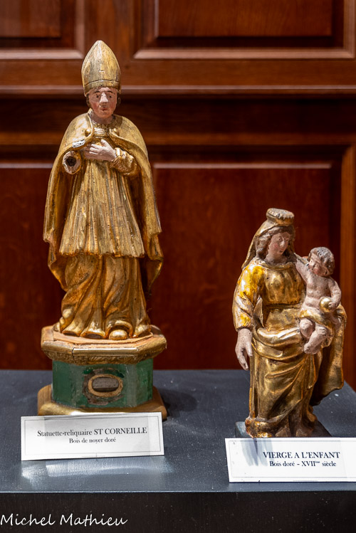 Tableau : Saint Corneille coiffé de la mitre, tient une crosse de la main gauche et fait le geste de la bénédiction de l'autre. Il est vêtu d'une chape décorée de figures. Il se détache sur un fond de paysage. Un angelot tenant une palme s'apprête à le couronner en partie supérieure. XIXe siècle.