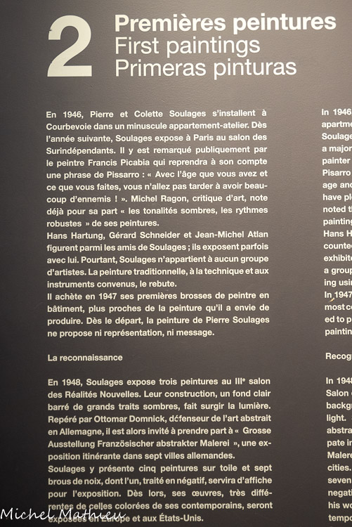 Soulages y présente cinq peintures sur toile et sept brous de noix, dont l’un, traité en négatif, servira d’affiche pour l’exposition. Dès lors, ses œuvres, très différentes de celles colorées de ses contemporains, seront exposées en Europe et aux États-Unis.