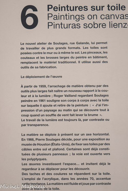 il achète en 1947 ses premières brosses de peintre en bâtiment, plus proches de la peinture qu’il a envie de produire. Dès le départ, la peinture de Pierre Soulages ne propose ni représentation, ni message.