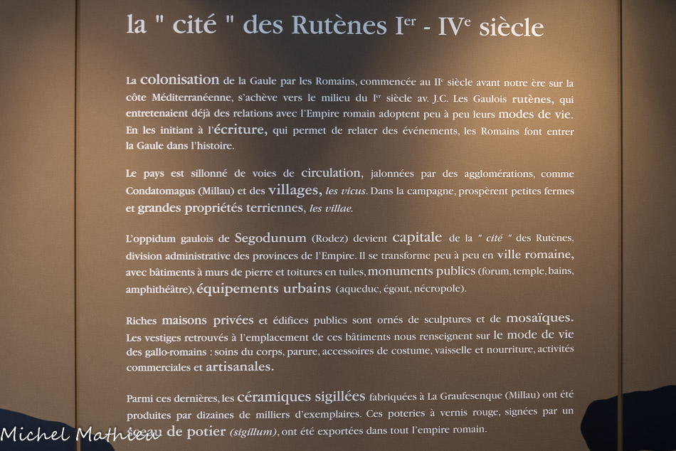 L’oppidum gaulois de Segodunum (Rodez) devient Capitale de la f cité f des Rutènes, division administrative des provinces de l’Empire. Il se transforme peu à peu en ville romaine, avec bâtiments à murs de pierre et toitures en tuiles, monuments publics (forum, temple, bains, amphithéâtre), équipements urbains (aqueduc, égout, nécropole).