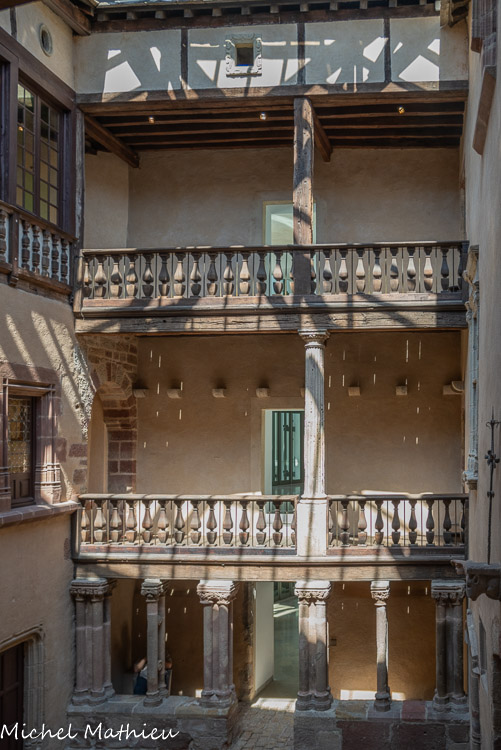 La cour présente une galerie en bois à l'étage, reposant par des colonnettes baroques sur une galerie en pierre d'inspiration gothique. L'escalier qui dessert les étages est situé dans le fond de cette galerie.