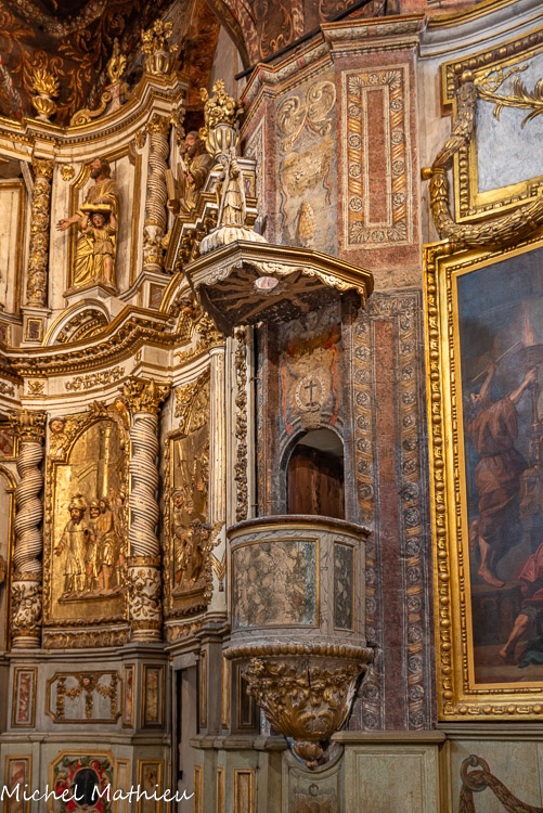 Ancienne chapelle des Pénitents noirs. Chaire à prêcher. 1ère moitié 18e siècle. L'accès à la chaire à prêcher se fait, à l'extérieur de la chapelle, dans le long corridor longeant la chapelle, par un emmarchement en calcaire. L'ensemble de l'œuvre est en bois taillé. La cuve présente des décors dans la masse recouverts de stuc doré à la feuille. La partie centrale de la cuve présente 3 panneaux délimités par des moulurations rapportées et dorées à la feuille. Le centre de ces panneaux comporte des décors peints polychrome. L'abat-voix, à pans coupés, est également en bois et présente des décors dans la masse recouverts de stuc et dorés à la feuille. La partie supérieure de l'abat-voix est couronnée par une statue en bois en ronde-bosse peinte polychrome et dorée à la feuille.