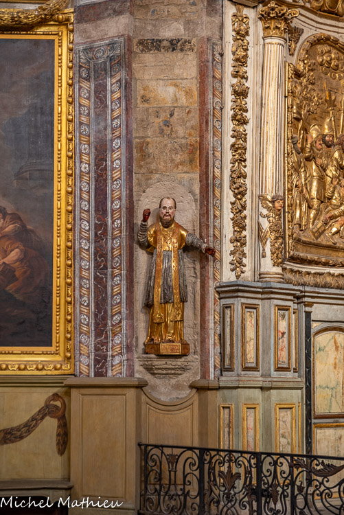 Ancienne chapelle des Pénitents noirs. Statue : Saint François de Sales. Bois : taillé, peint (polychrome), doré, argenté. Le saint patron de la chapelle est représenté en prêtre, vêtu d'un surplis doré et d'une mozette argentée. Cette statue en bois datant de la première moitié du 18e siècle est une ronde bosse. Au dessus de la niche est peint un visage humain. Saint François de Sales est connu pour son engagement à la fin du XVIème siècle contre la Réforme protestante et son exaltation du culte de la Croix.