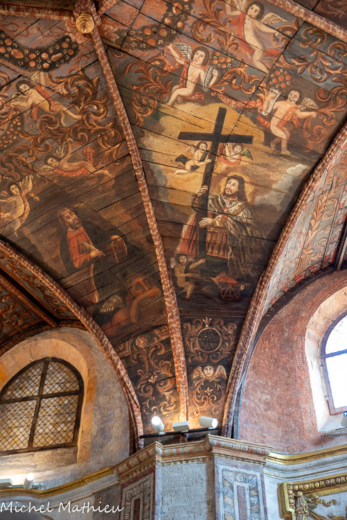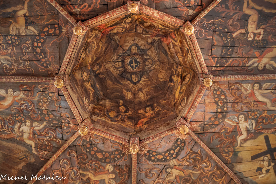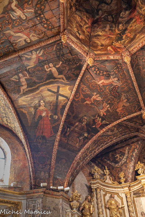 Ancienne chapelle des Pénitents noirs. Le centre de la coupole présente un labarum : médaillon bordé d'inscriptions et comportant en son centre une croix. Autour de ce dernier, partent des rayons lumineux. 4 têtes d'anges ailés bordent ce médaillon. Des faisceaux de rayons lumineux partent de chacune des 4 têtes d'ange. 6 anges ailés et 15 têtes d'anges ailées se distribuent dans une nuée sur tout le pourtour de la coupole. Autour de la coupole, une guirlande de fleurs et de fruits (pomme, poire, grenade) court sur chacun des 8 panneaux.