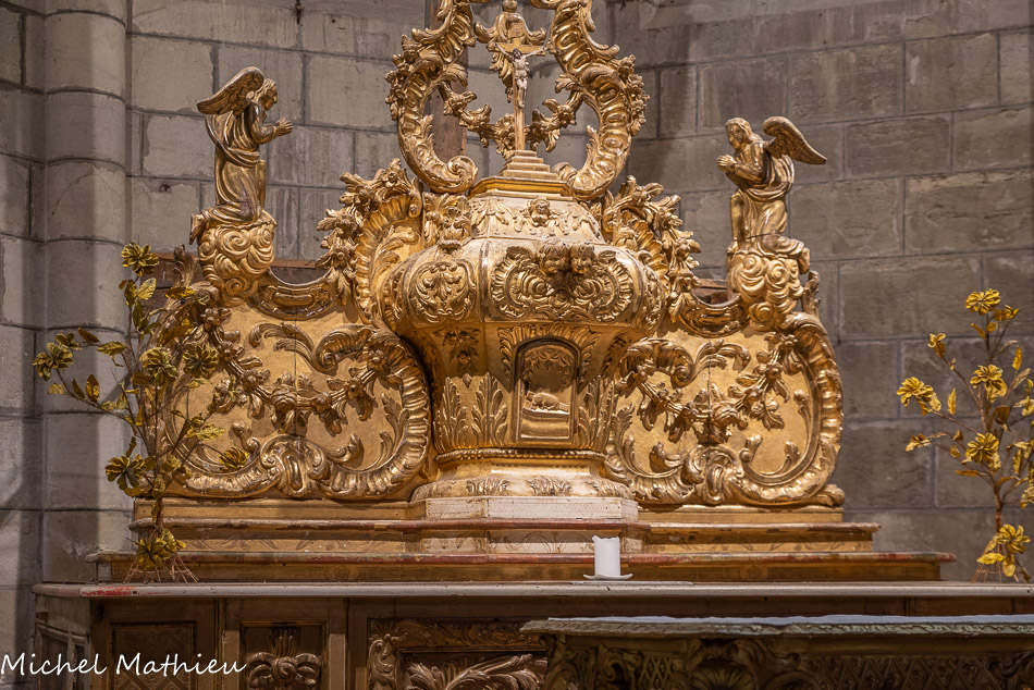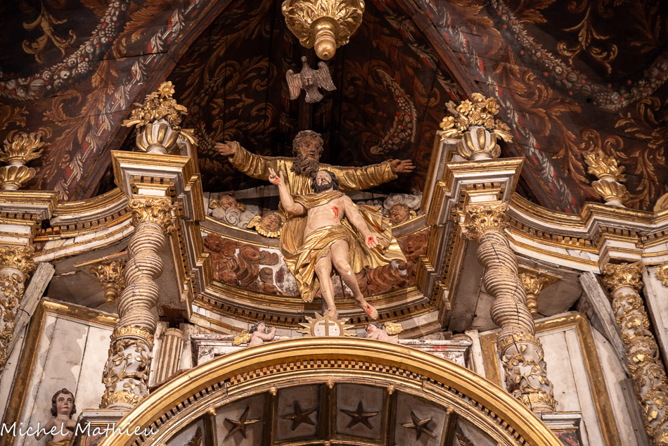 Ancienne chapelle des Pénitents noirs. Le Christ en croix dans un baldaquin couvert d’une voûte à caissons semés d’étoiles et de têtes d'anges. Un second entablement couronne le retable, soutenu par six colonnes et surmonté d’une série de pots-à-feu et de pots-à-fleurs. Les quatre évangélistes et deux anges encadrent la Trinité : le Christ ressuscité est accueilli par Dieu le Père sous la protection de la colombe du Saint-Esprit.