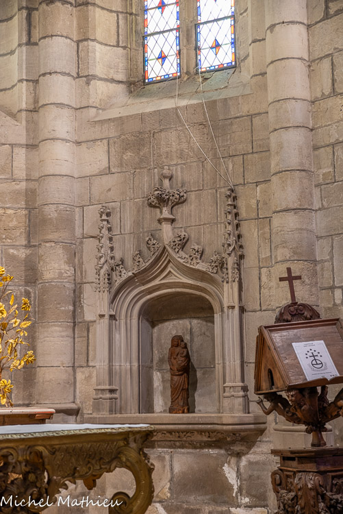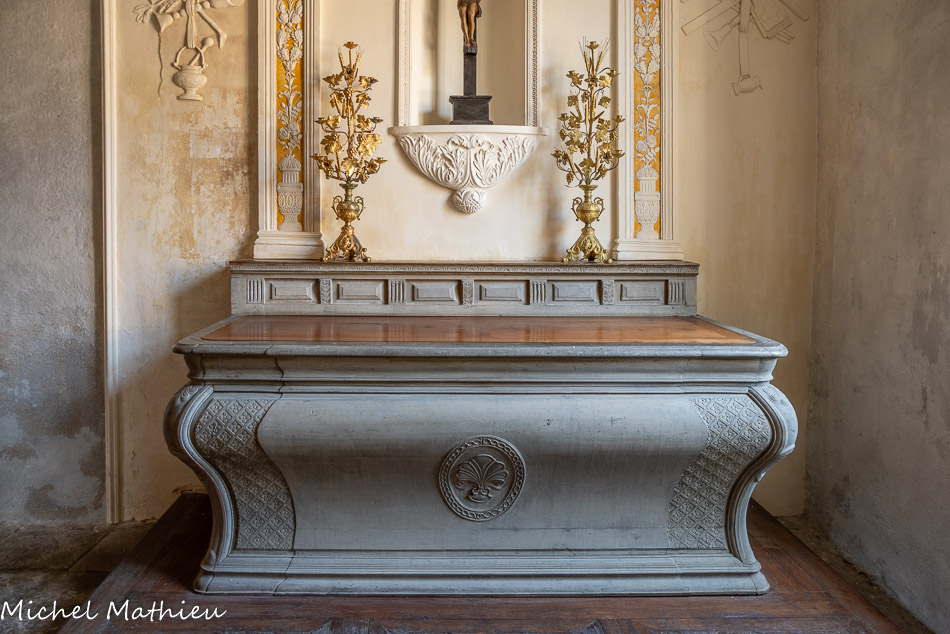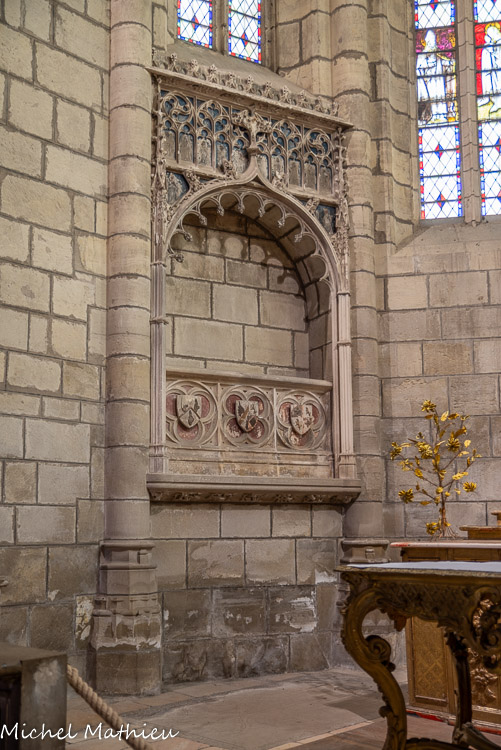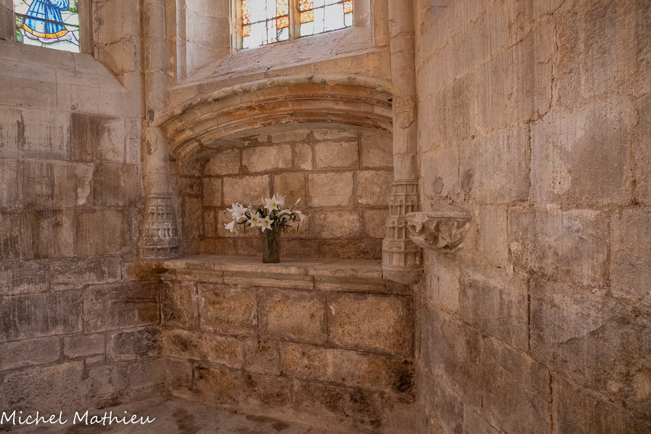 Le chapitre. Sous la fenêtre d'axe, une niche sert d'autel ; elle est ornée d'une moulure torsadée et de branches écotées, caractéristiques du vocabulaire ornemental de la fin du XVe siècle. Les deux colonnettes portent les armes de Catherine Garnier et de Vésian Valette. La présence d'un autel dans la salle du chapitre, est une particularité des chartreuses.