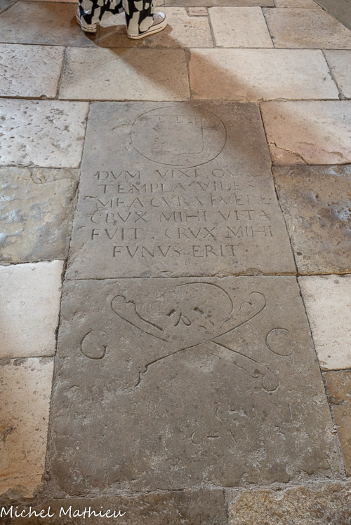 Ancienne chapelle des Pénitents noirs. Dalle funéraire de Géraud Caval, trésorier de la confrérie. Sous la tribune d'orgue, entre les deux piliers. L'œuvre est composée de deux éléments de calcaire taillés et présentant des décors et des inscriptions à relief gravé. La partie supérieure de la dalle funéraire comporte un écu dans lequel figure, en partie haute, 3 croix grecques. L'écu est inscrit dans un cercle. Au centre de la dalle figure une tête de mort au centre d'une croisée d'os humains. En 1669, alors que la construction de la chapelle n'est pas achevée, la confrérie accuse un déficit de 896 livres afin de pouvoir achever les travaux de construction.Iil fait don de cette somme à la confrérie en échange de l'autorisation de pouvoir être inhumé dans la chapelle après sa mort. Les inscriptions présentes sur la dalle funéraire reprennent le monogramme du donateur ainsi qu'une devise écrite en latin signifiant : Durant ma vie ce temple que tu vois fut mon soin. La croix a été ma vie. La croix sera ma mort.