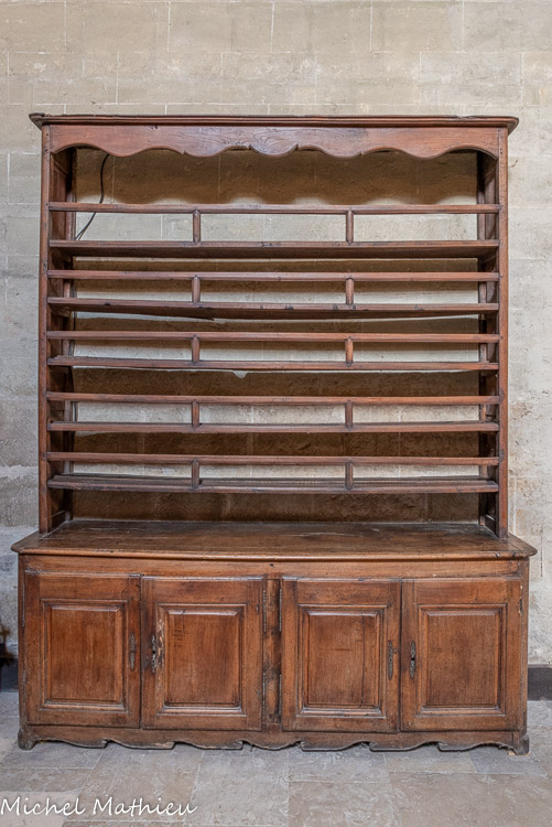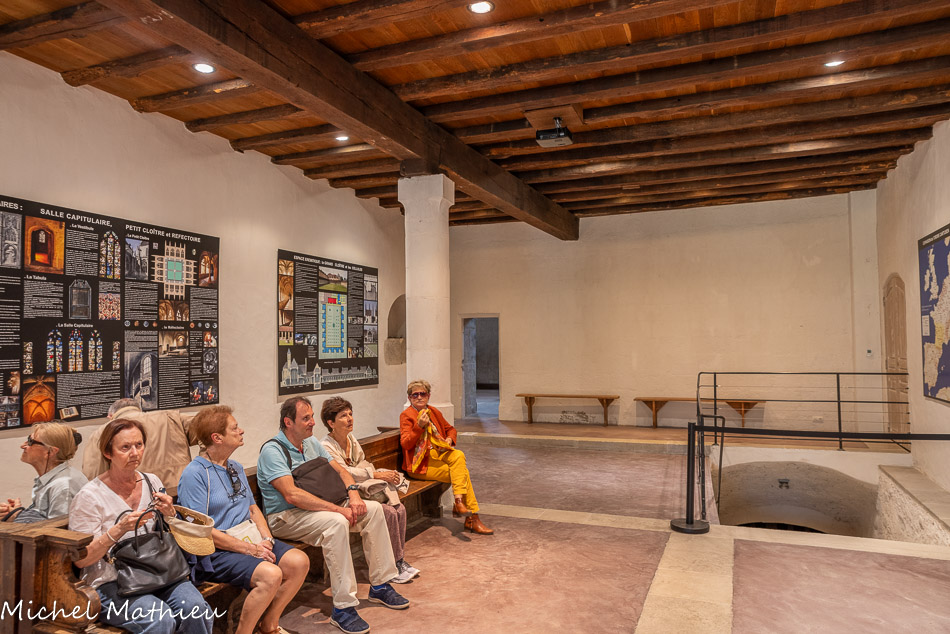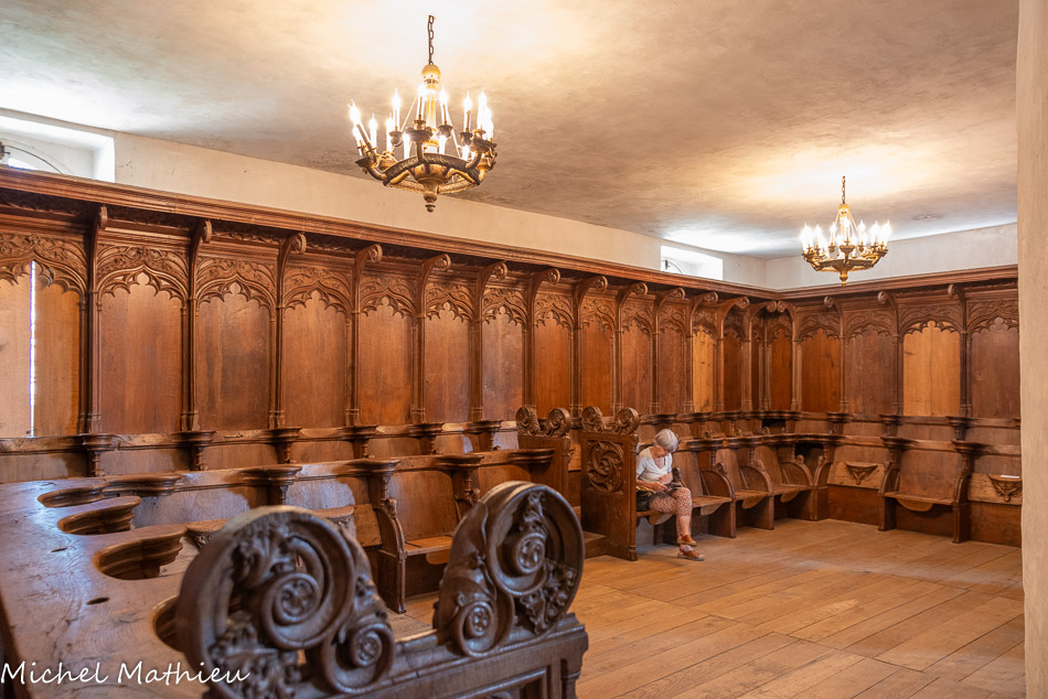 Le réfectoire. Le mobilier ancien, constitué de bancs avec dossiers à plis de serviette, nous montre la disposition du réfectoire : contre le mur oriental, se trouve le siège du prieur ; De part et d'autres, sur une sorte de plate-forme en ressaut faite en bois borduré de pierre, sont adossés les bancs des pères.