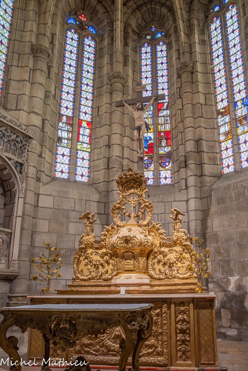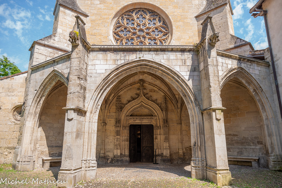 Le petit cloître. Situé au flanc Sud de l'église, le petit cloître est constitué d'une galerie voûtée de croisées d'ogive, éclairée de quatre baies flamboyantes sur chaque face. Si les motifs de remplages sont d'une grande variété, la structure de chaque face est semblable : aux angles, les contreforts sont de section réduite par rapport aux trois contreforts qui épaulent les deux grandes baies centrales à trois meneaux, les baies extérieures étant réduites à deux meneaux. Chaque contrefort se déploie en pinacle au-dessus des toitures.