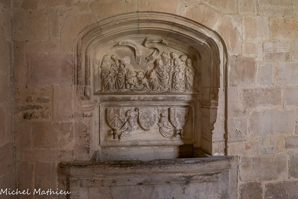 Bien que vandalisé lors des guerres de religions (les visages ont été martelés), le bas-relief permet de deviner le Christ au centre, lavant les pieds de ses disciples. Sur le phylactère de droite, on peut lire : « Si non laverote, non habebis partem mecum » (Si je ne te lave pas, tu n'auras pas de part avec moi) ; Pierre répond sur le phylactère de gauche : « Domine, non tantum pedes meos, sed et manus, et caput » (Seigneur, pas seulement les pieds, mais encore les mains et la tête).