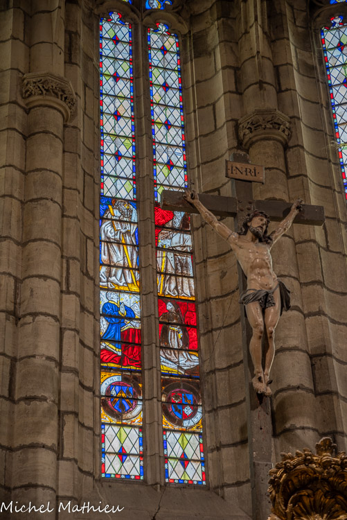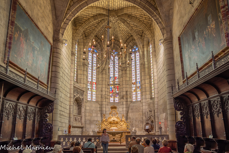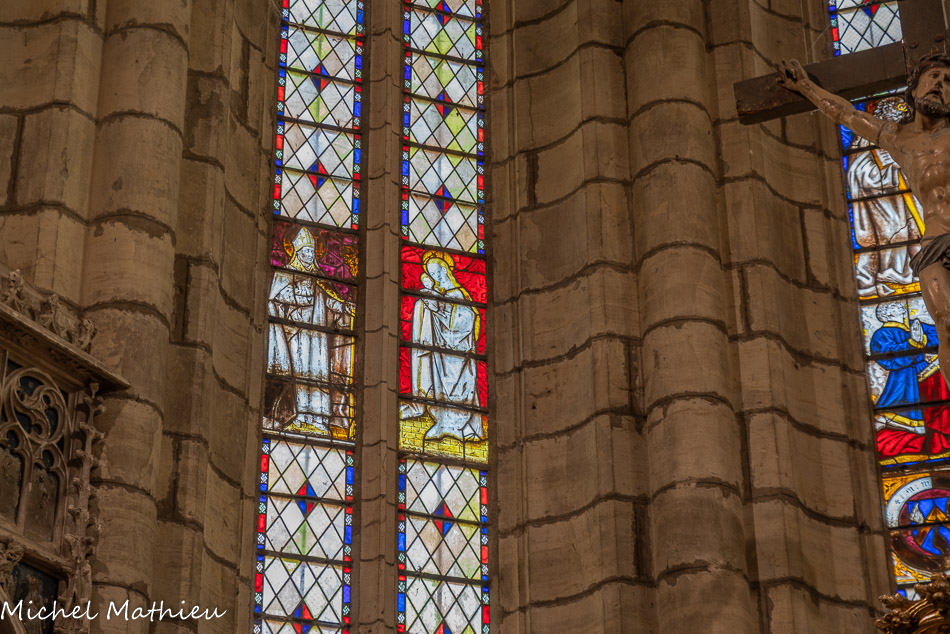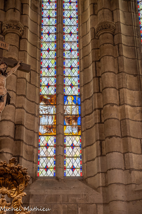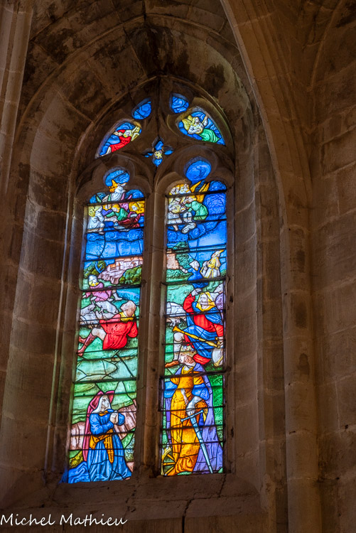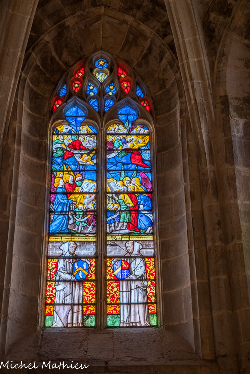 Le chapitre. De part et d'autre, les vitraux représentent les donateurs avec leurs saints patrons, Vésian Valette, à gauche, avec saint Georges,