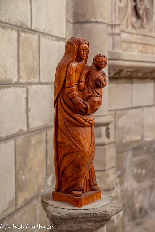 Ancienne chapelle des Pénitents noirs. Statue : Vierge à l'Enfant. Bois : taillé, peint. Cette statue dont l'auteur est inconnu est d'une très grande qualité malgré les manques et les fentes quelle présente. Cette oeuvre du 17ème siècle est installée dans la niche de l'autel secondaire saint Charles. La Vierge, en pied, de face, portant l'Enfant Jésus sur son bras senestre. Son bras dextre est tendu et sa main dextre figure un geste suggérant que le modèle devait tenir un objet. La Vierge est présentée vêtue d'un vêtement blanc maintenu par une ceinture rouge et d'un manteau rouge. Elle porte un voile blanc qui laisse apparaître des cheveux bouclés et déliés. L'Enfant Jésus porte un vêtement blanc et est figuré les cheveux bouclés et déliés. Les pommettes des sujets sont suggérées par des rehauts de couleur rouge.