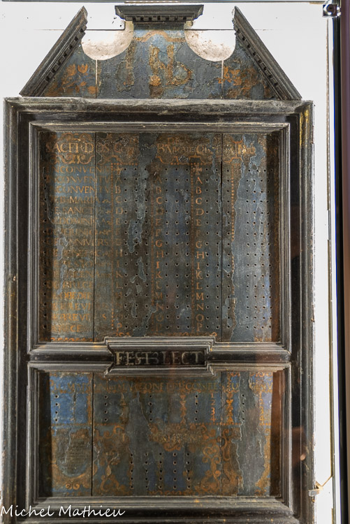 En partie basse, sont précisées les lectures pour temps de fêtes. Les alignements de trous permettaient au sacristain d'affecter à chaque père, soit la célébration, soit la lecture pour chaque jour, avec indication de la nature de l’office, et de l’autel, grâce à de petites «pointes ».