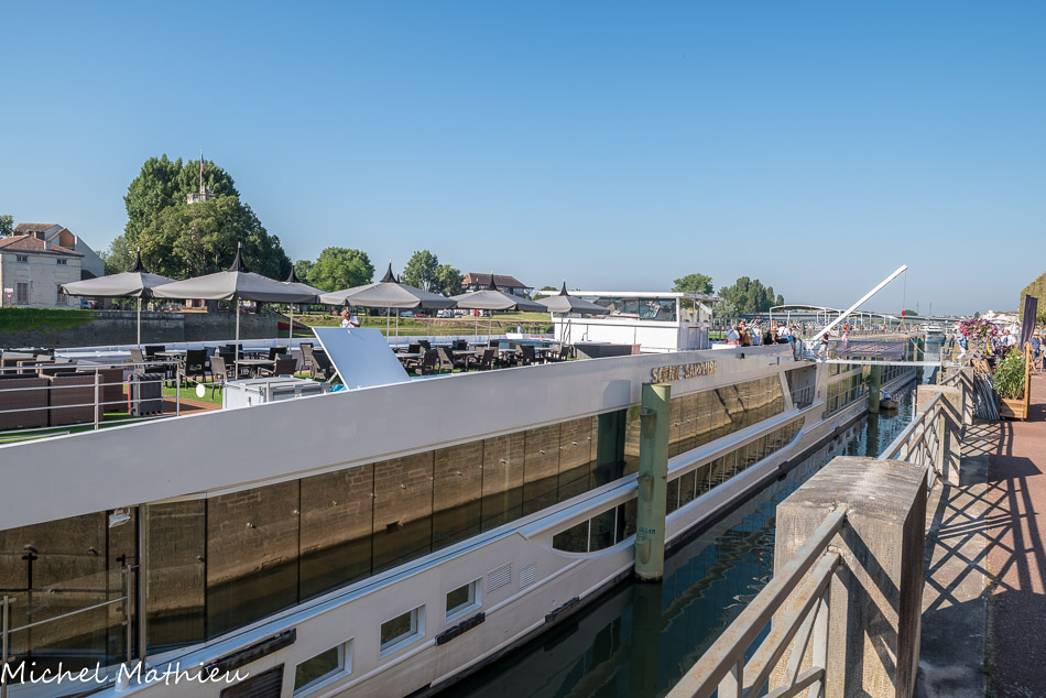 Bateau de croisiéristes qui vient d'Arles, en passant pazr Avignon et Vienne. Malheureusement le canal du Rhône au Rhin a été abandonné..
