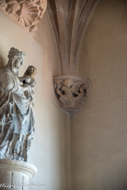 La chapelle a recueilli des œuvres d'art provenant des parties démolies : boiseries armoriées
