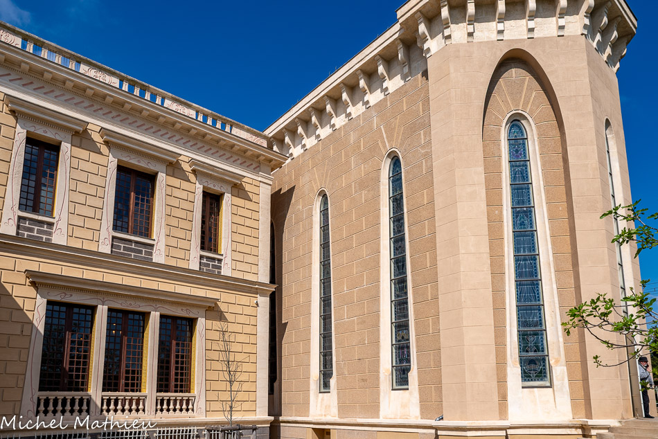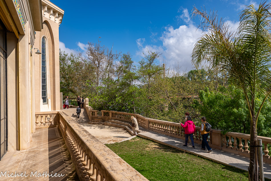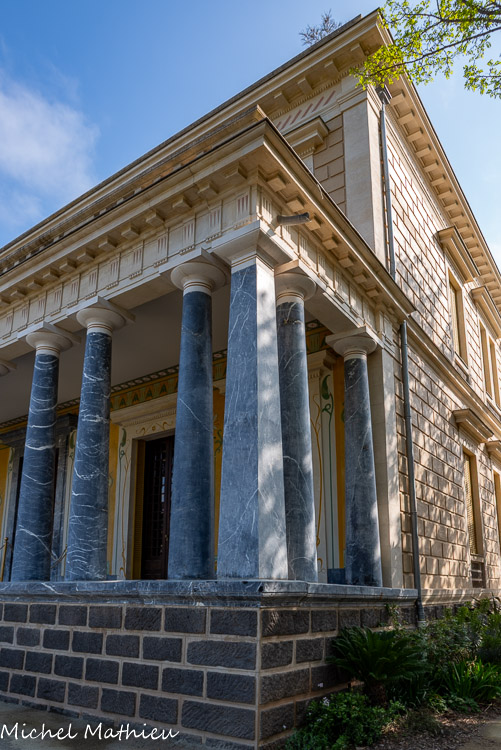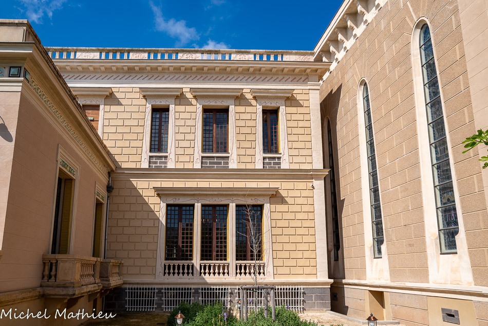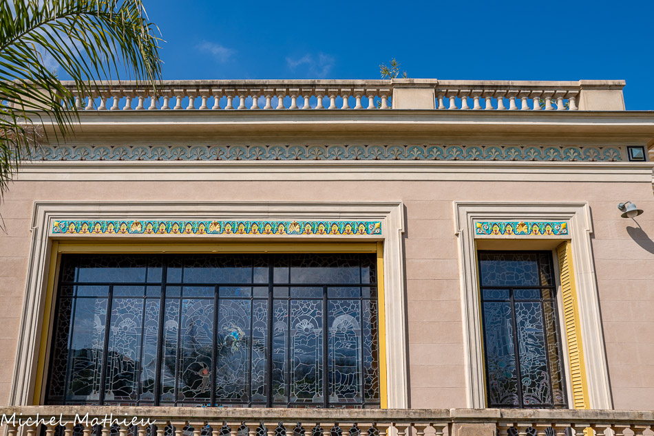 se détache sur un mur à décor de papyrus et de grandes de fleurs de lotus égyptiennes. Cette composition antiquisante est accentuée par le jeu de toits-terrasses, par la polychromie des façades et par le pavement en mosaïque de la galerie à colonnes.