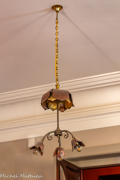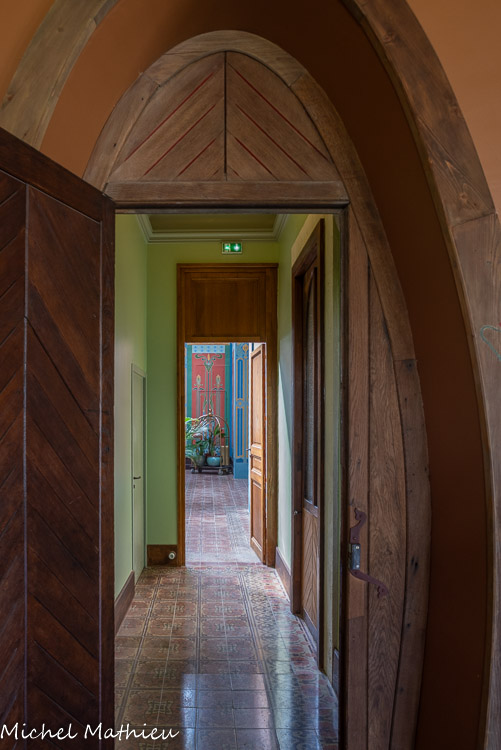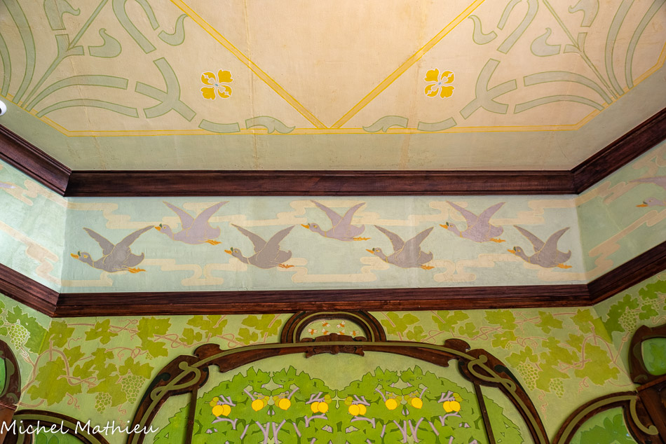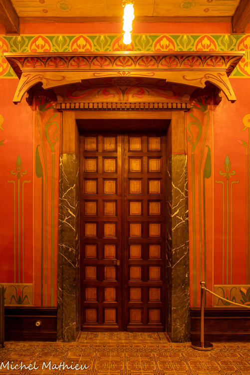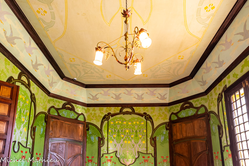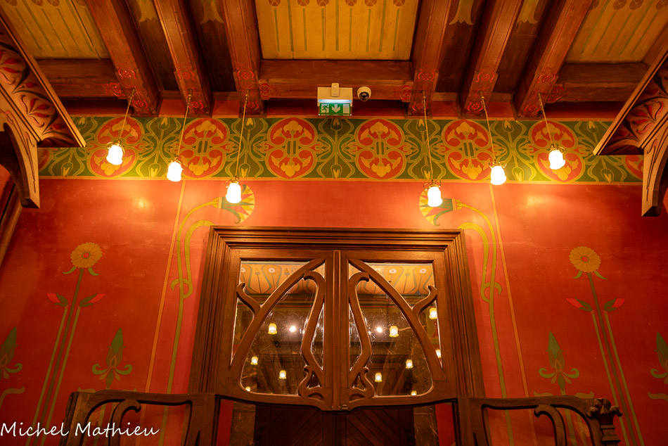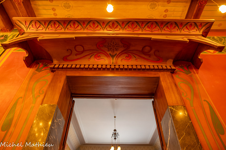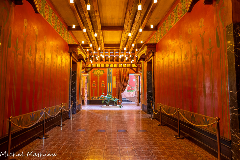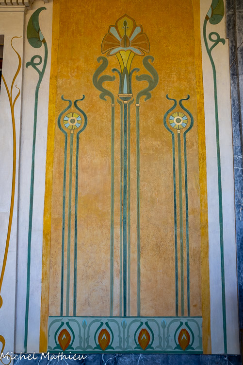 Le grand vestibule est rythmé par quatre portes égyptisantes à battants doubles. Les murs ornés de motifs végétaux entrelacés sont typiquement Art nouveau.