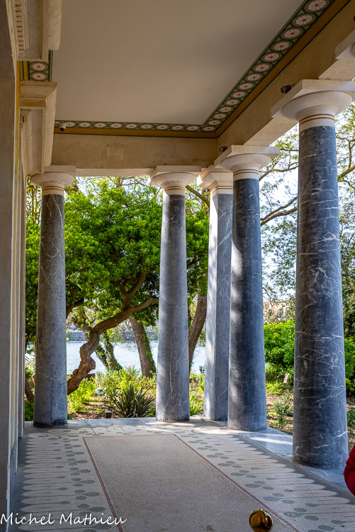 L’atrium aux colonnes en onyx rose d'Algérie et le rouge pompéien des murs offrent une vision de “villa antique”. C’est là que se retrouvaient les nombreux convives au centre de la demeure dans cette ambiance polychrome où les fleurs aux longues tiges envoûtaient le regard. Les colonnes encadrent un bassin d’albâtre.