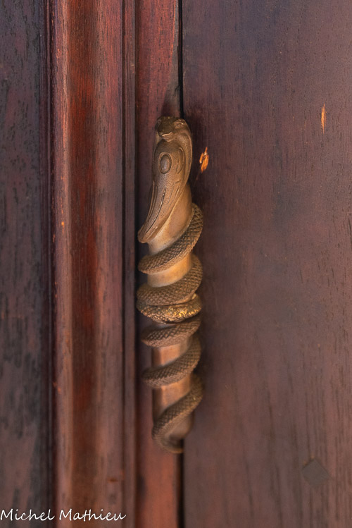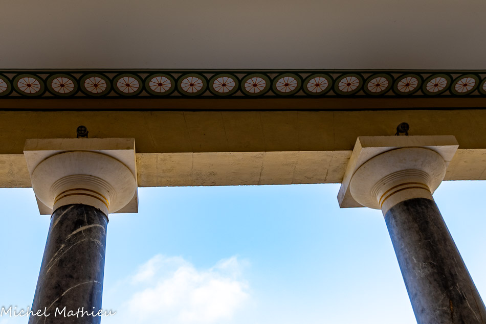mue. Le triglyphe de la frise ressemble à un groupe de trois colonnes papyriformes, le signe hiéroglyphique M 125. Parée de marbre noir, la porte principale se présente à l’égyptienne ou presque. Une lourde corniche moulurée supporte les dormants de la porte, traitée pour rendre l’aspect d’une « corniche à gorge ».