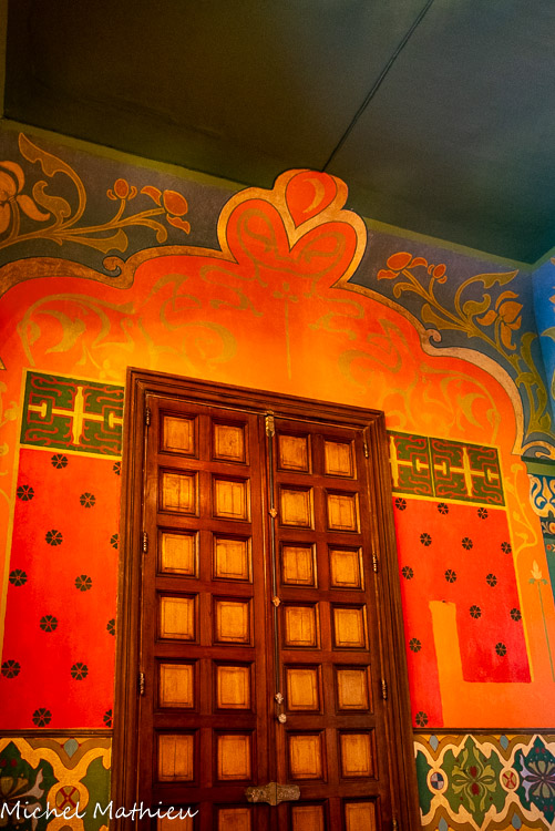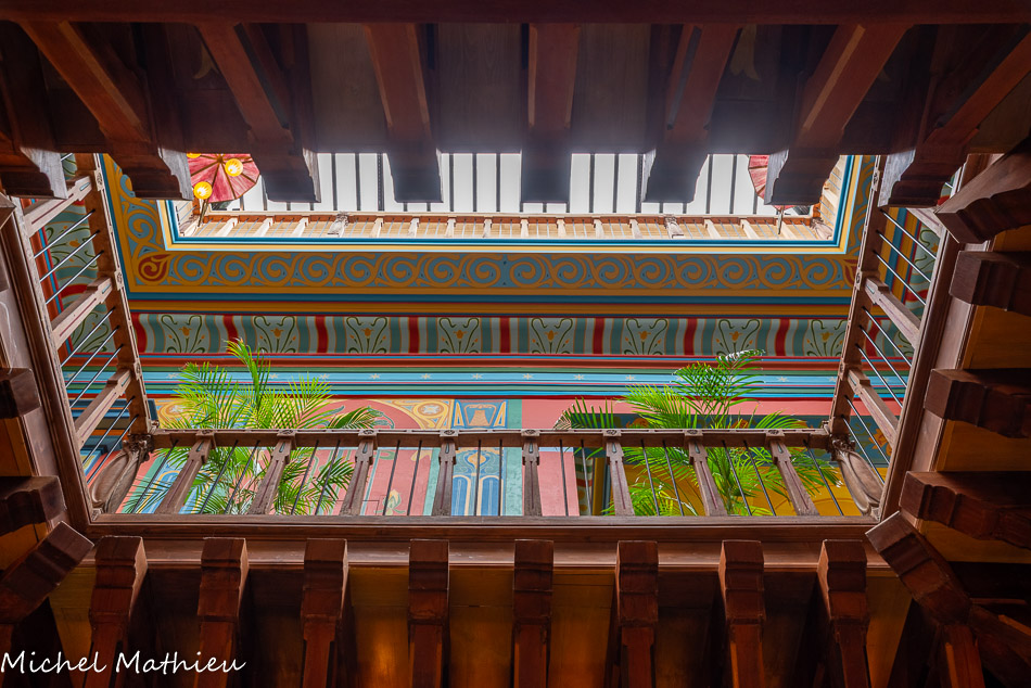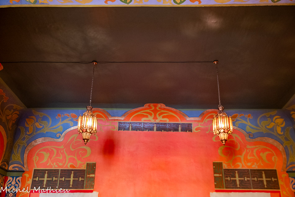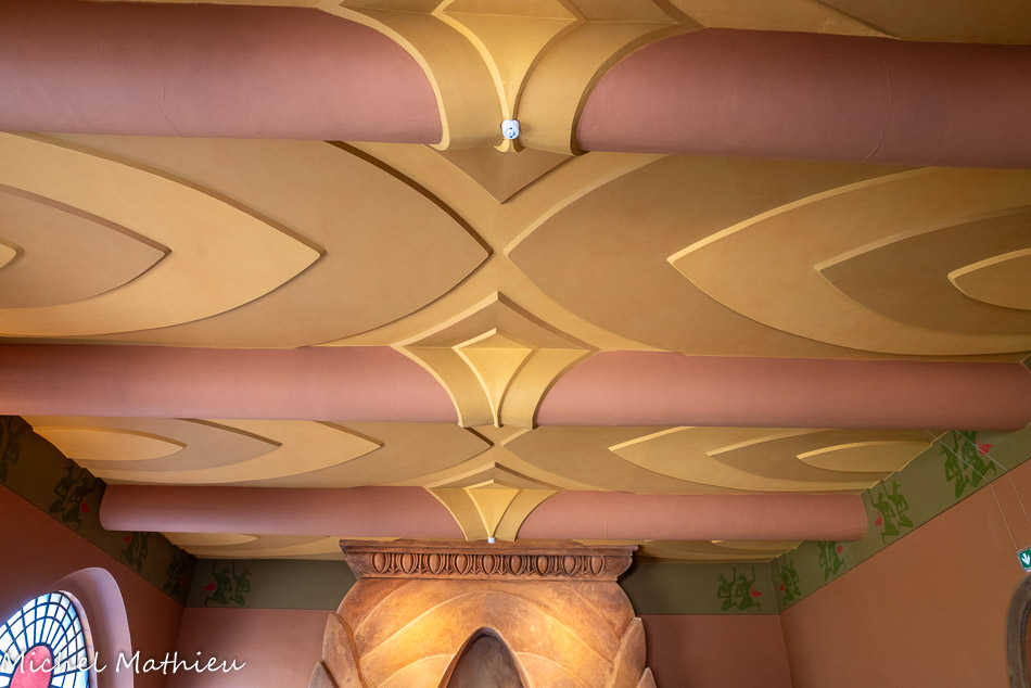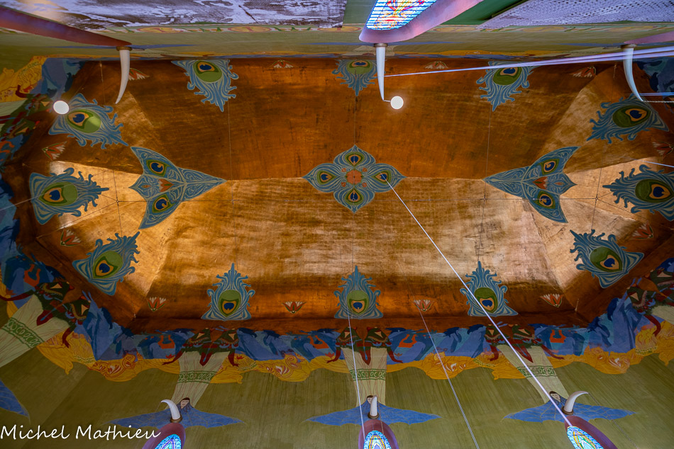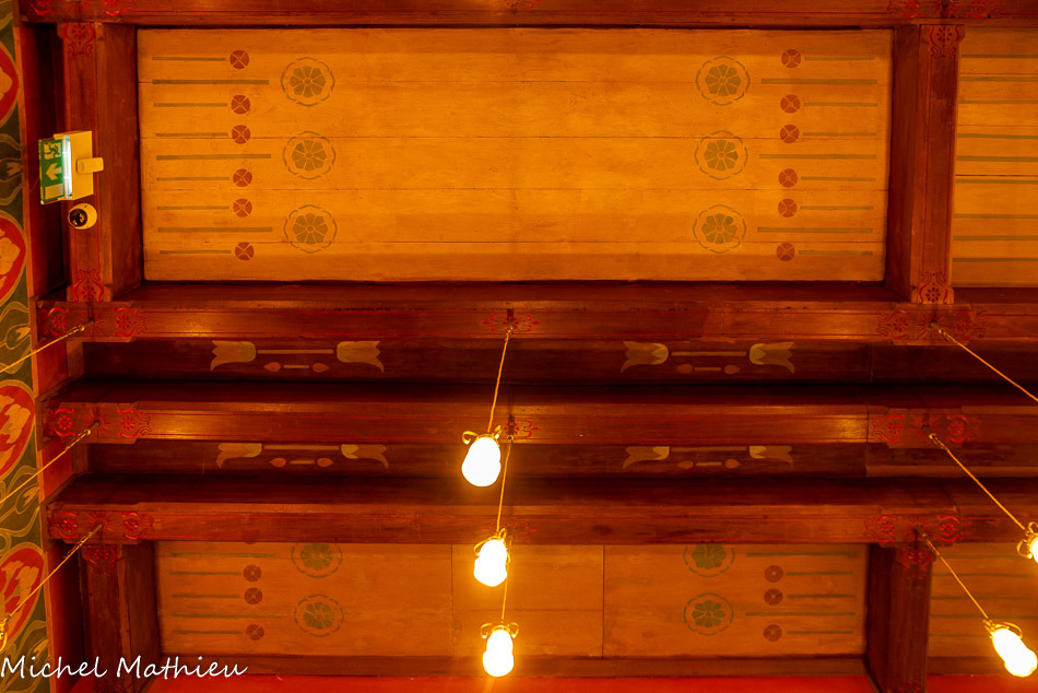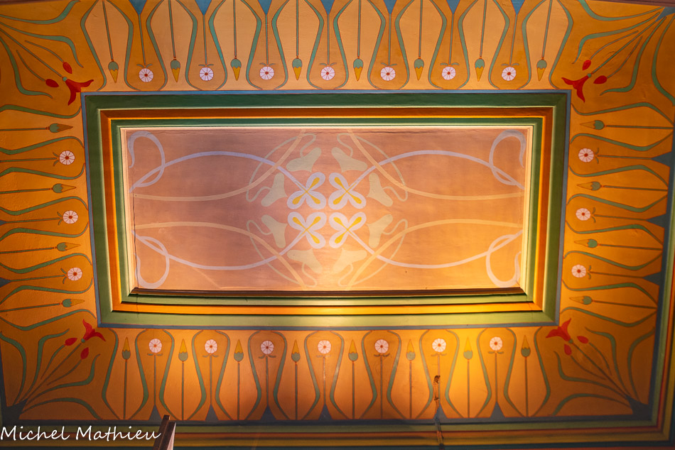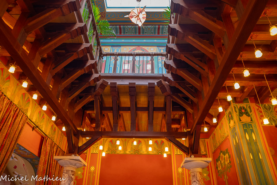 Le grand vestibule. Les peintures du plafond sont encadrées par des caissons en bois, imitation de poutres. Ce plafond de bois est parsemé de petites lampes de verre couleur