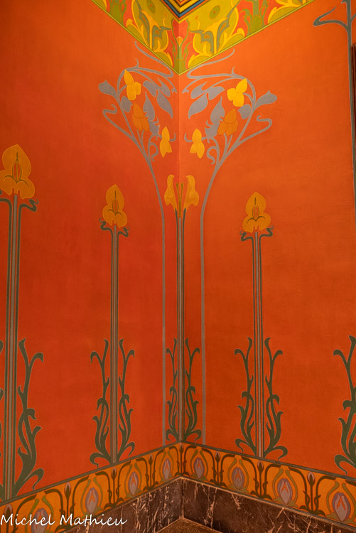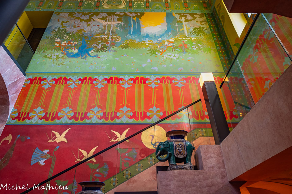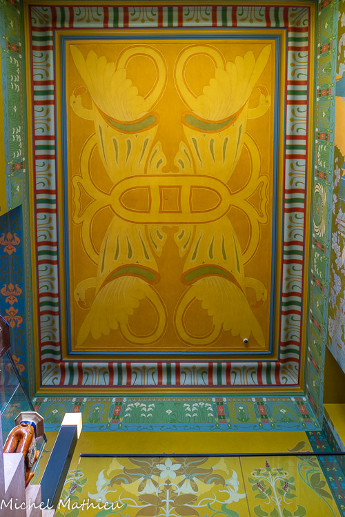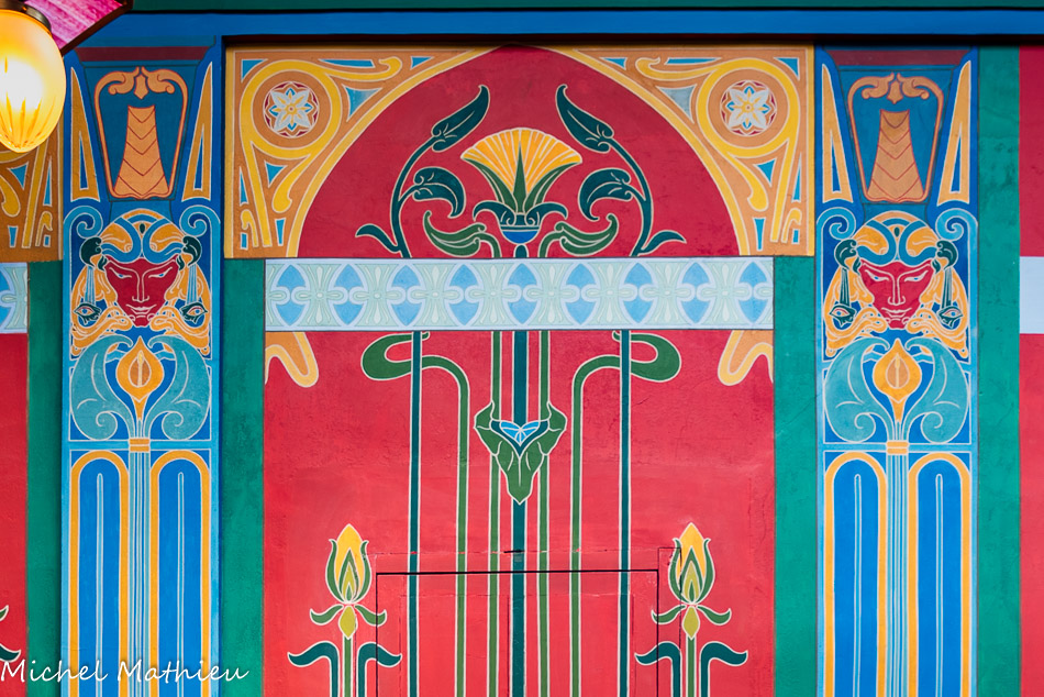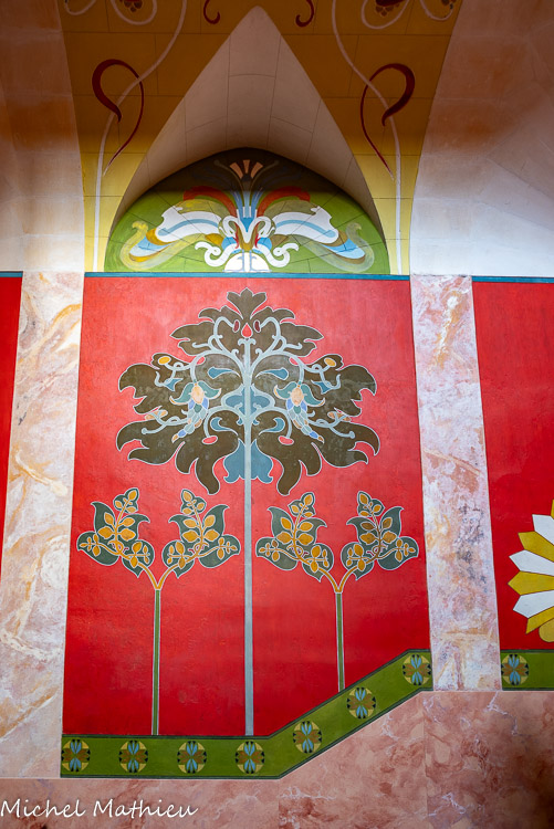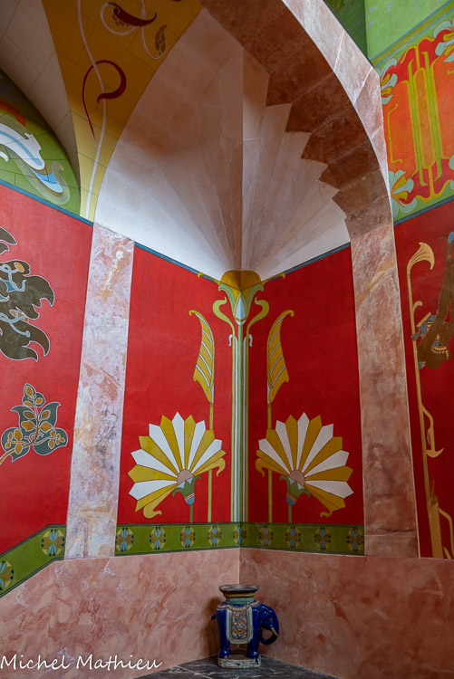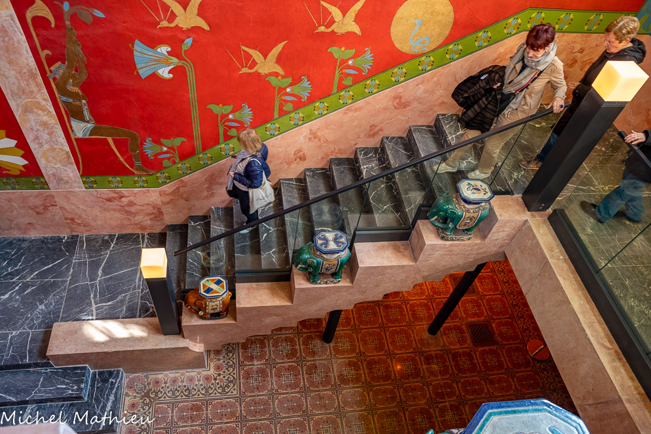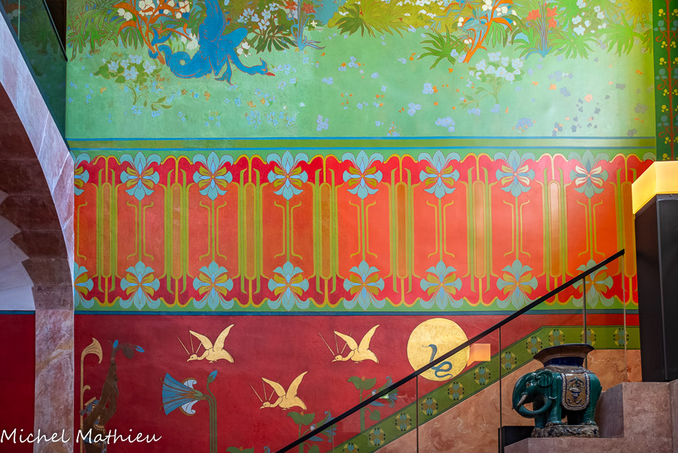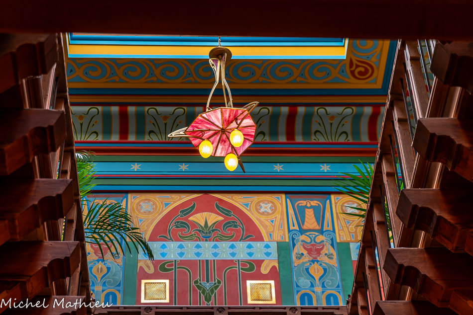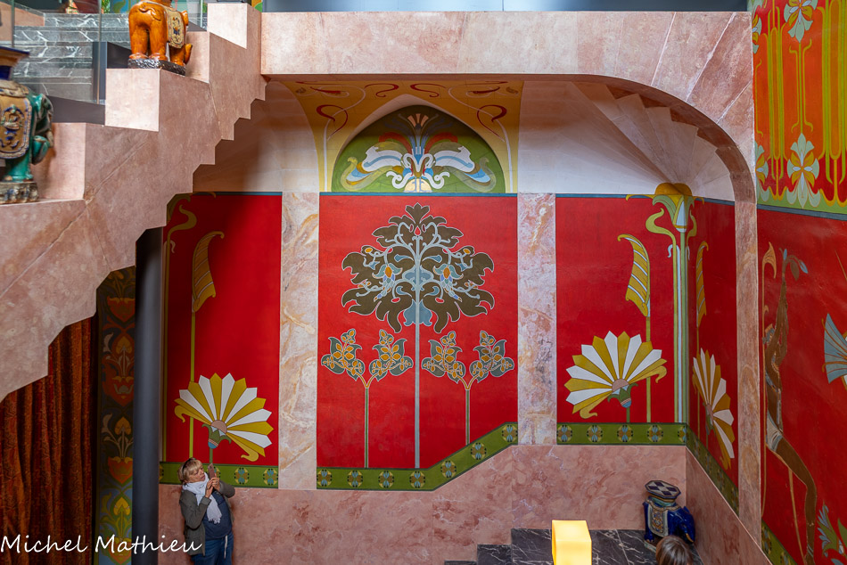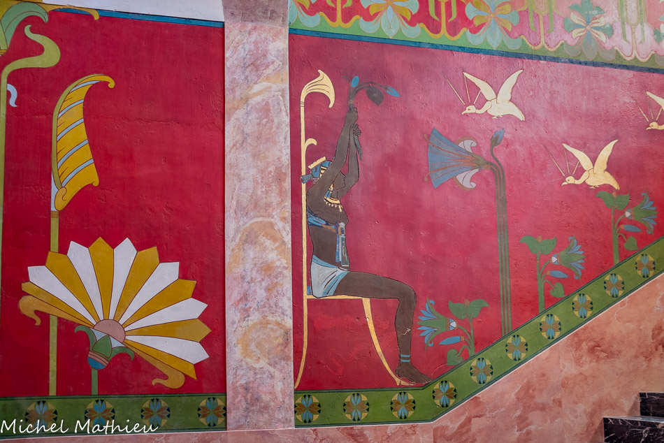 par les voyages en Orient de son propriétaire et son goût pour l’Art nouveau flamboyant. Au premier regard, rien d’égyptien ici, puisque le fond rouge n’est employé en Égypte, ni pour le décor des temples, ni celui des tombes, ni même dans les habitations.