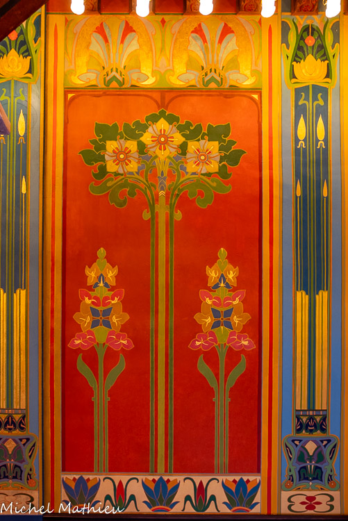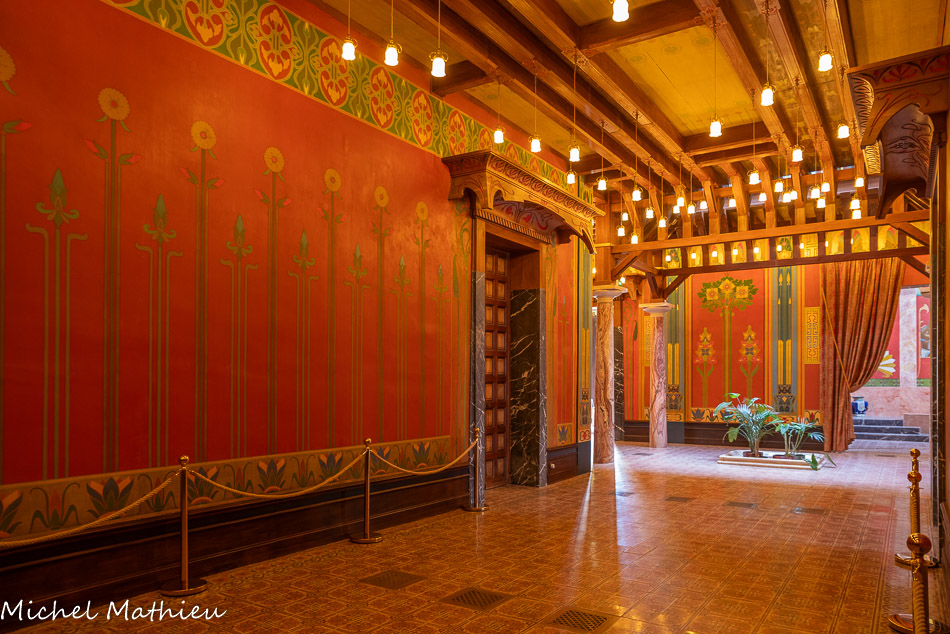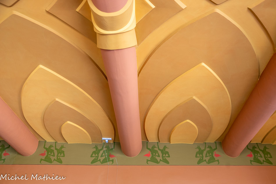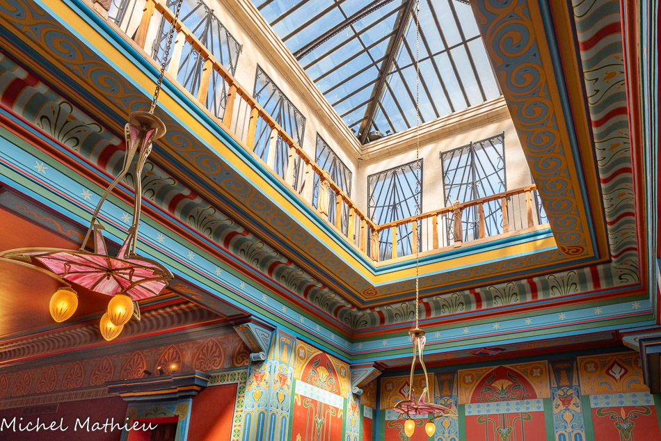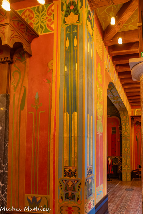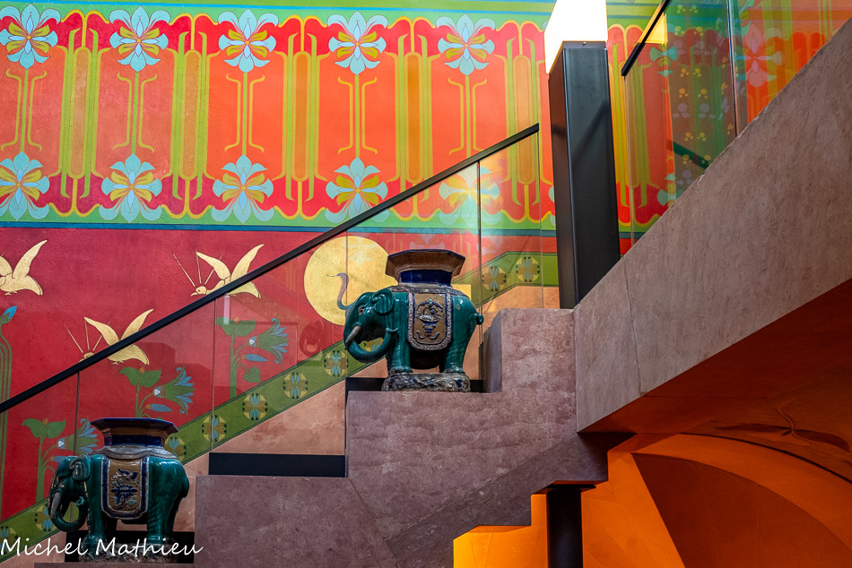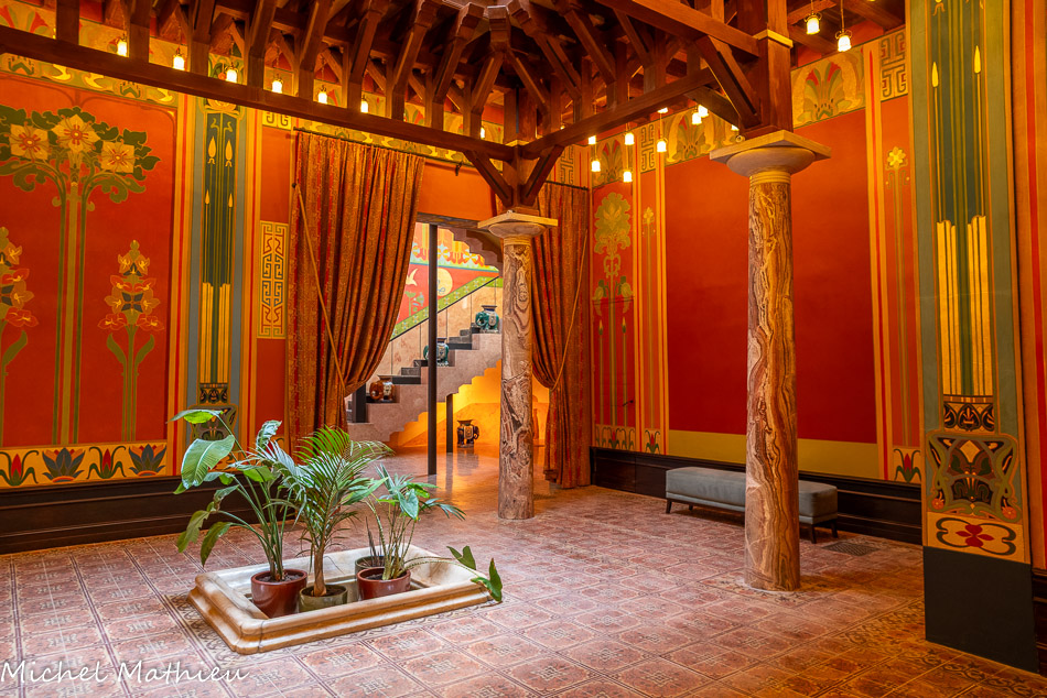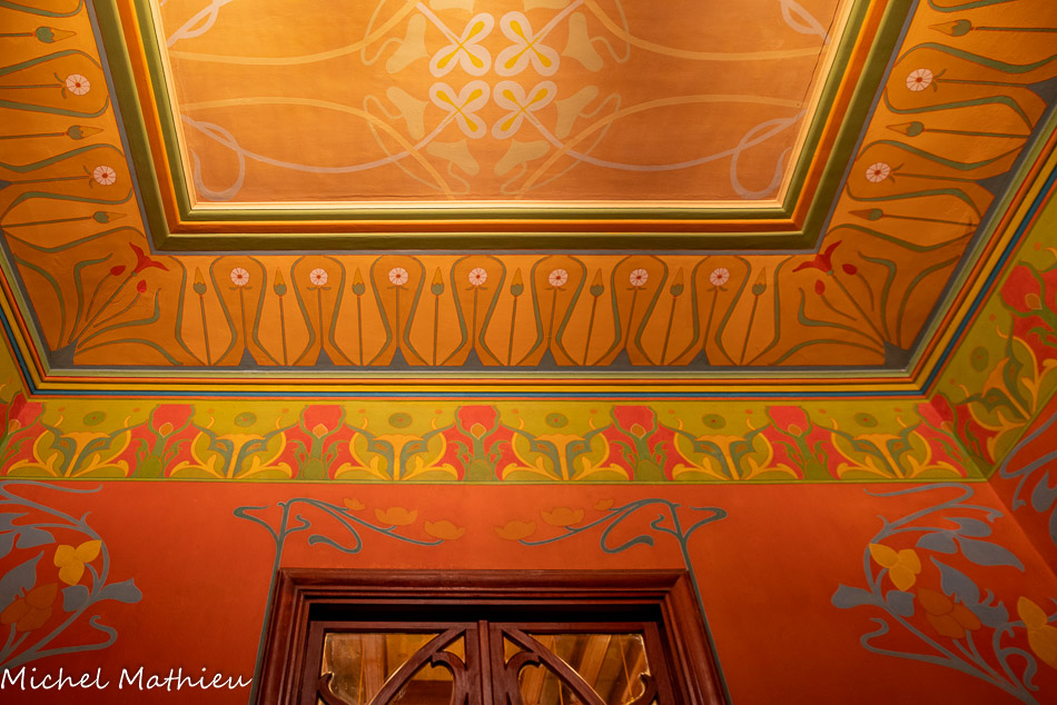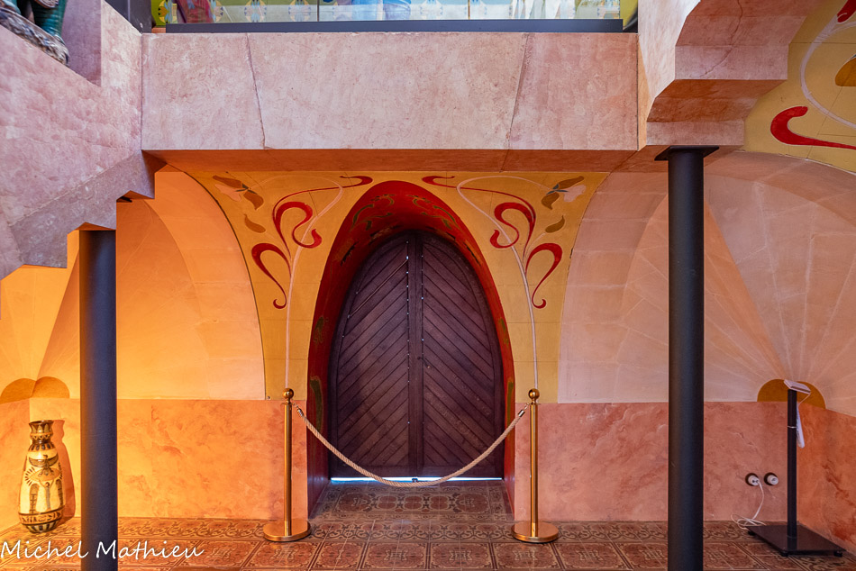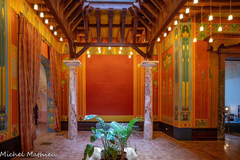 par les voyages en Orient de son propriétaire et son goût pour l’Art nouveau flamboyant. Au premier regard, rien d’égyptien ici, puisque le fond rouge n’est employé en Égypte, ni pour le décor des temples, ni celui des tombes, ni même dans les habitations.
