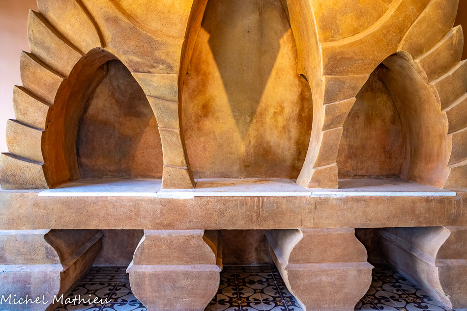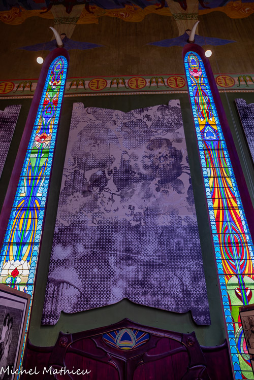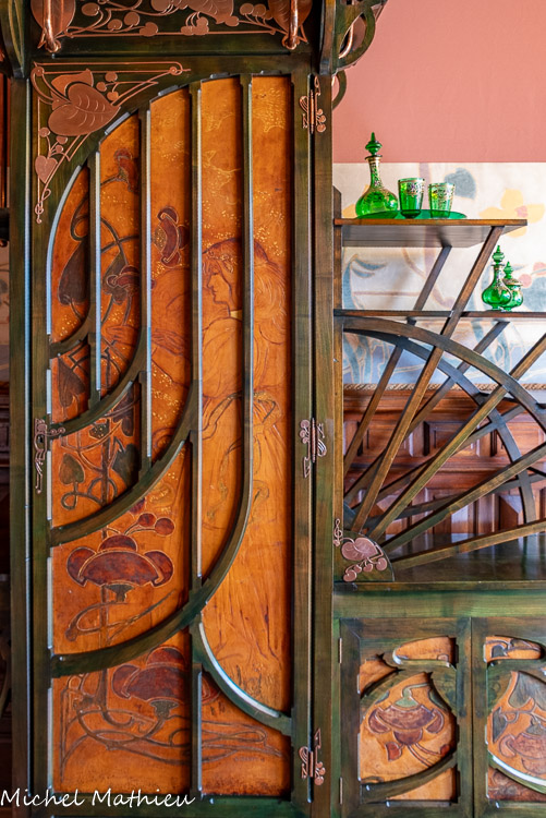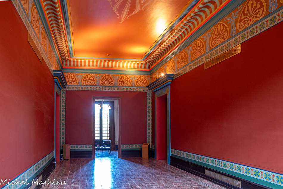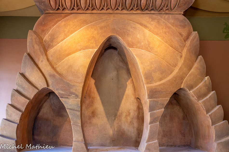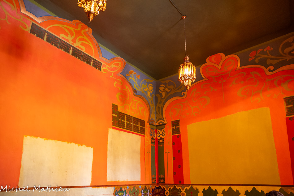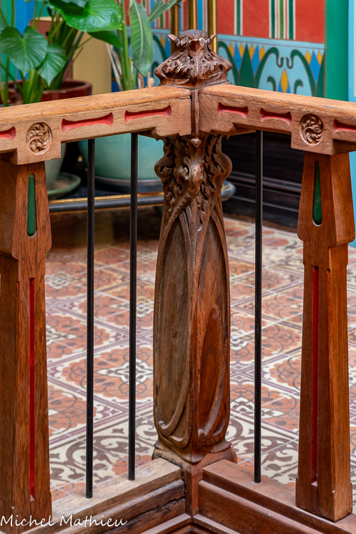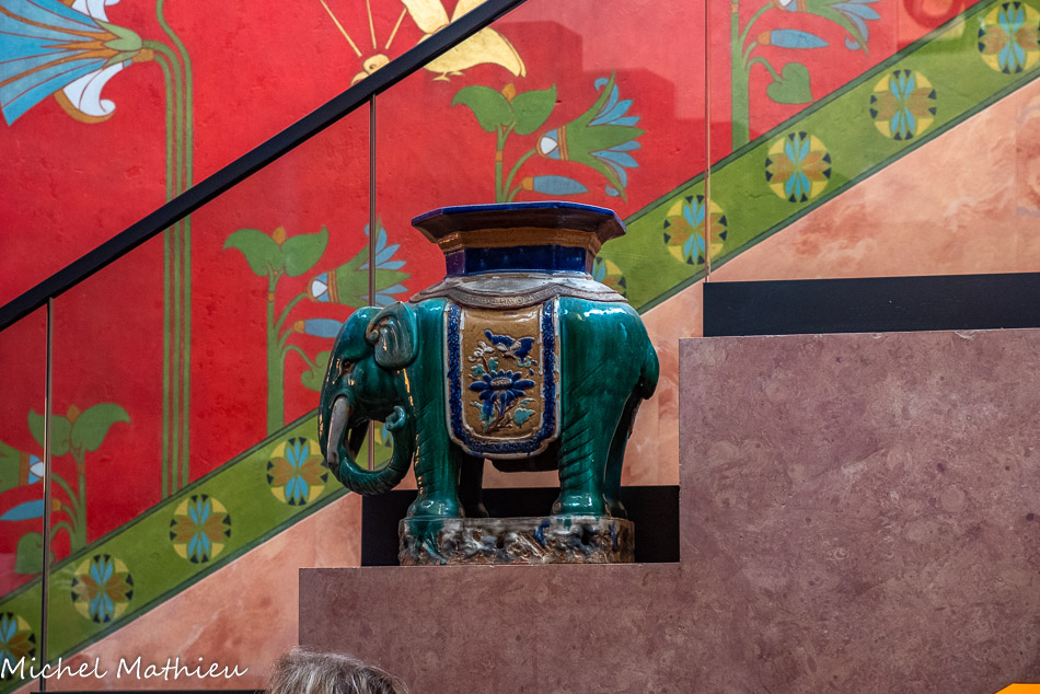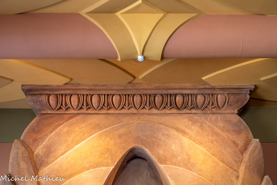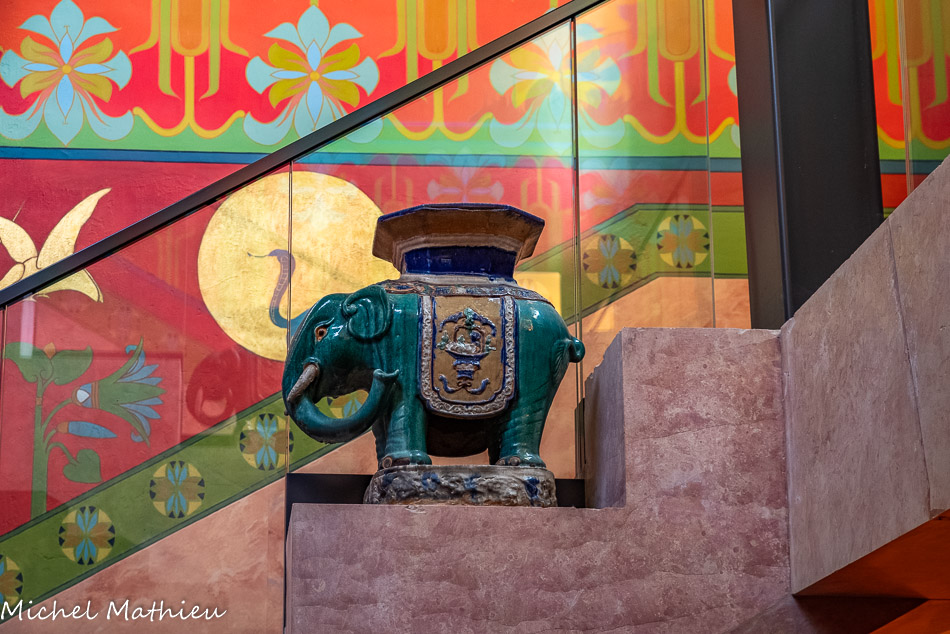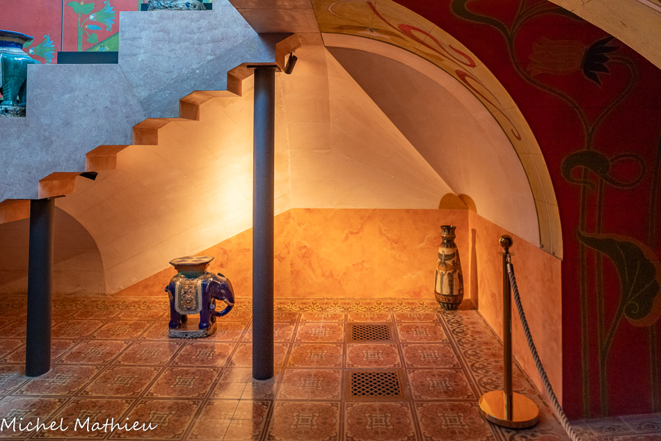 par les voyages en Orient de son propriétaire et son goût pour l’Art nouveau flamboyant. Au premier regard, rien d’égyptien ici, puisque le fond rouge n’est employé en Égypte, ni pour le décor des temples, ni celui des tombes, ni même dans les habitations.