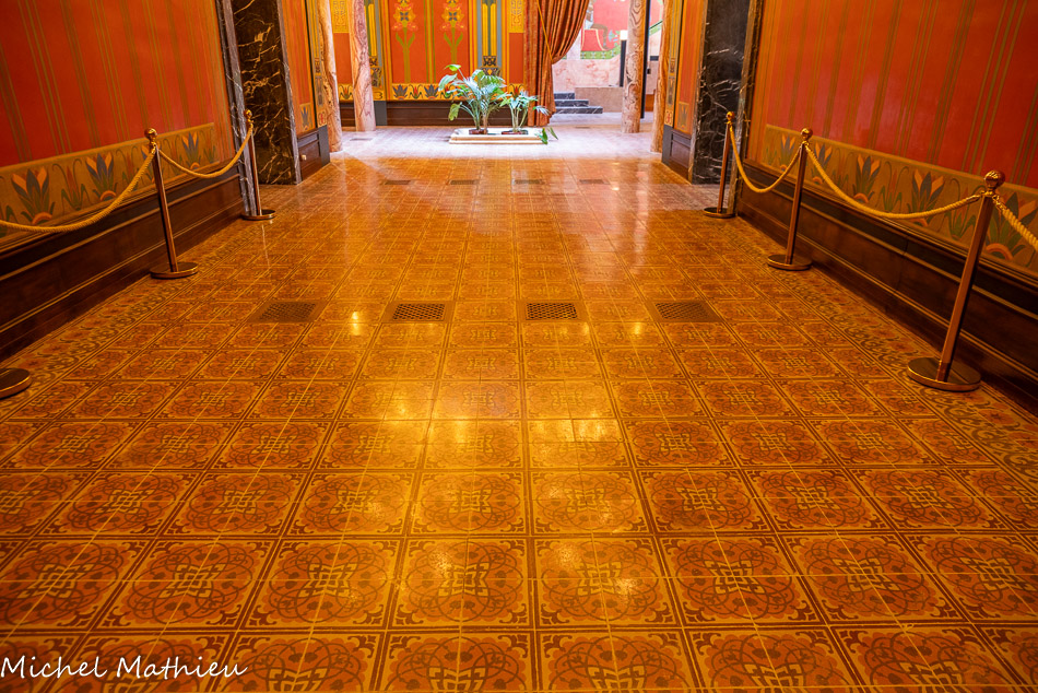 Le grand vestibule. Le monument reflète un style éclectique, avec un mélange de styles Art Nouveau et néo-grec, ainsi que des décors majestueux inspirés de l’égyptomanie et de l’orientalisme. Son architecture crée une véritable symbiose entre les différents arts et styles de ses décorations.