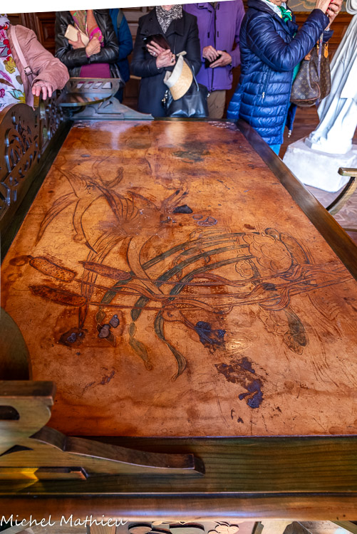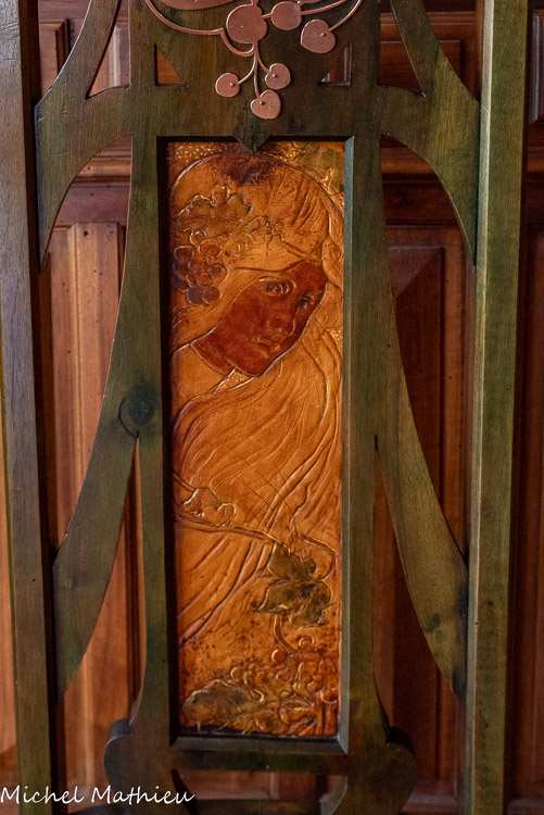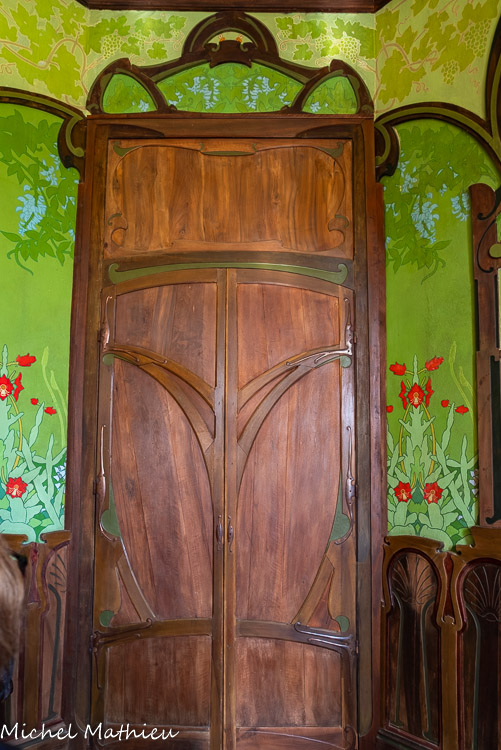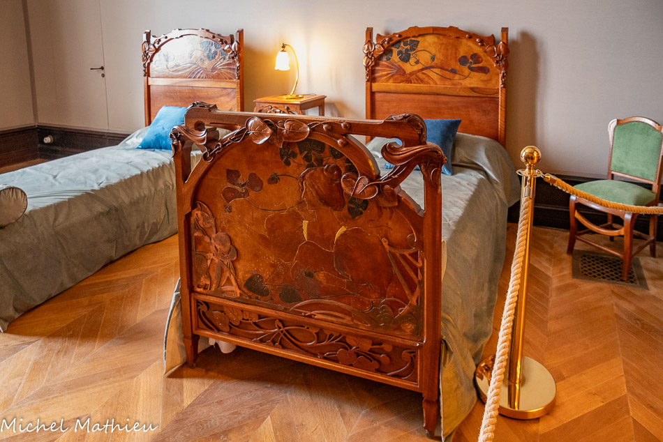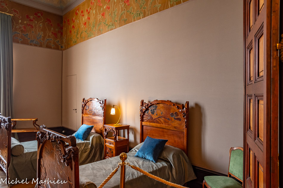 La chambre de sa soeur, Marguerite Laurens. Les éléments sont en noyer sculpté de motifs floraux (de type nelumbos ou fleurs de lotus en boutons), complétés par des panneaux en cuir peint et doré figurant des jeunes filles cueillant des fleurs, ainsi que des parties en cuivre découpées et posées en applique au chevet des lits.