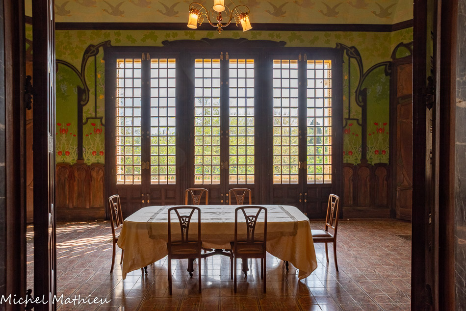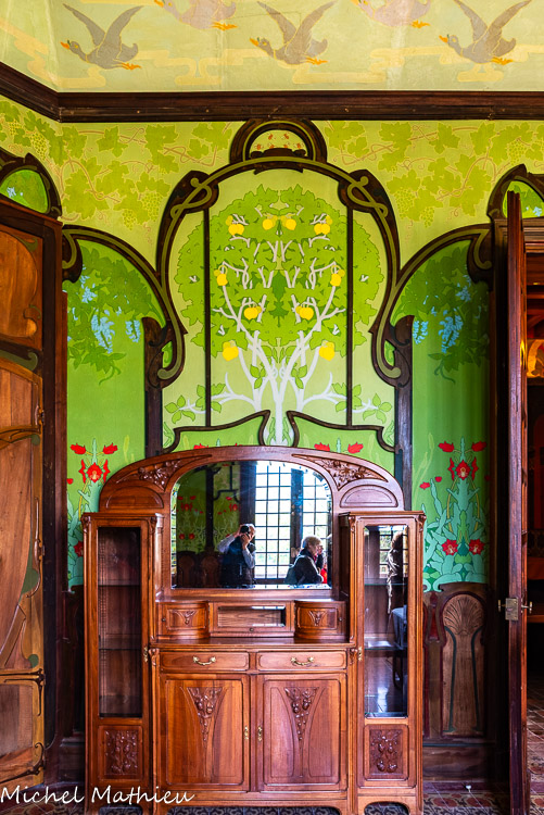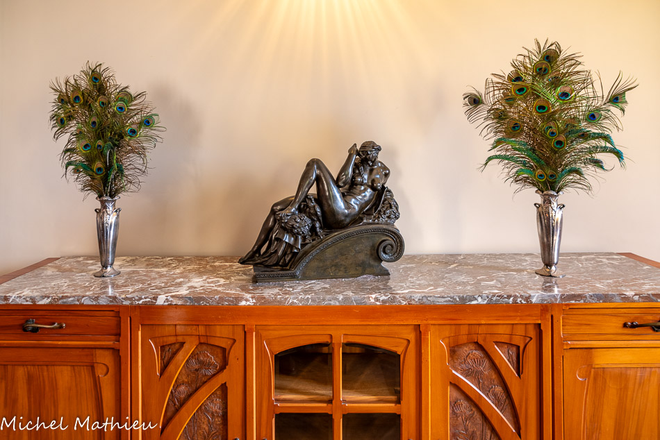 Le petit vestibule. En ce qui concerne la bâtisse, Emanuel Lauresn dessine lui-même les plans du château, sans architecte, ce qui rend la demeure unique de part sa composition et la répartition des pièces. Ses inspirations en matière de décoration proviennent de ses nombreux voyages et de son goût prononcé pour l’Art nouveau qui s’inspire de la femme, de la nature, ainsi que de l’utilisation des courbes. Un courant artistique très à l’avant-garde pour la région. En plus de ce courant artistique, la demeure est un véritable assemblage hétéroclite d’inspirations : orientalisme, égyptomanie et mobilier contemporain réalisé sur mesure pour la demeure.