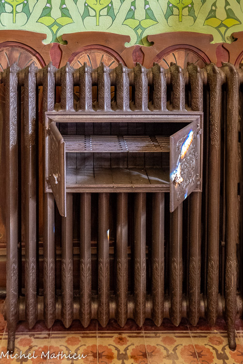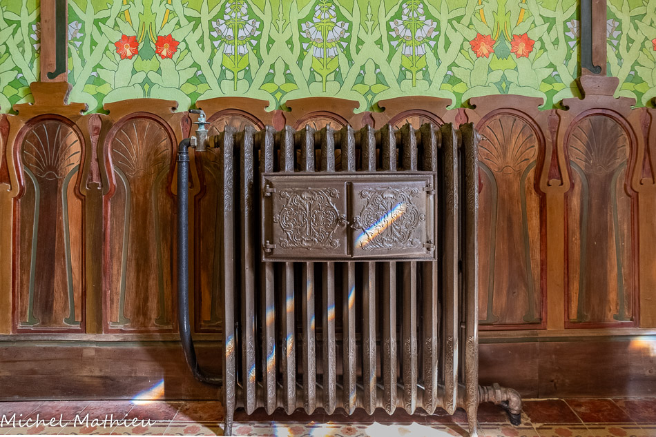 Le petit vestibule. Pour ce qui est de la décoration, Emmanuel Laurens fait appel à des artistes marqués par le courant Art Nouveau : le peintre Eugène Dufour qui réalisa les peintures du grand salon, le décorateur et ébéniste Léon Cauvy qui réalisa la plupart des meubles en bois qui sont toutes des pièces uniques spécialement créées sur commande pour la demeure, en collabration avec Paul Arnavielhe, menuisier-ensemblier montpelliérain, ou encore l’architecte d’intérieur Eugène Simas à qui nous devons la salle de bain et sa baignoire-piscine décorée de faïences des ateliers Sarreguemines ainsi que les vitraux des appartements du château.