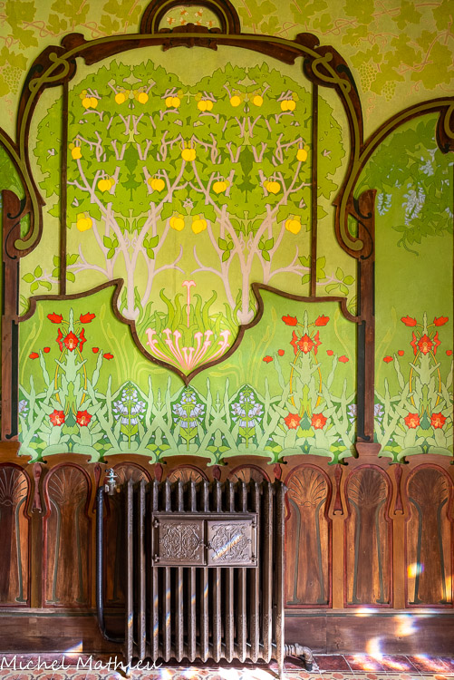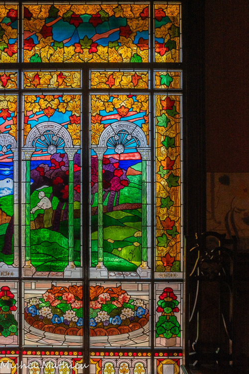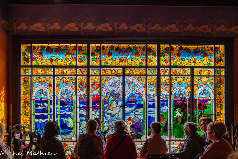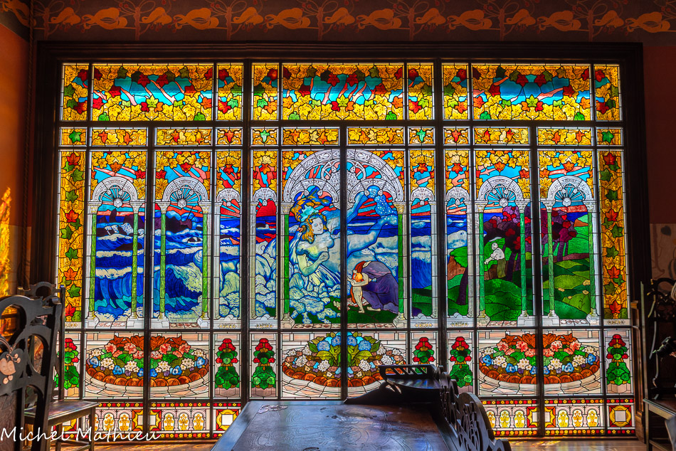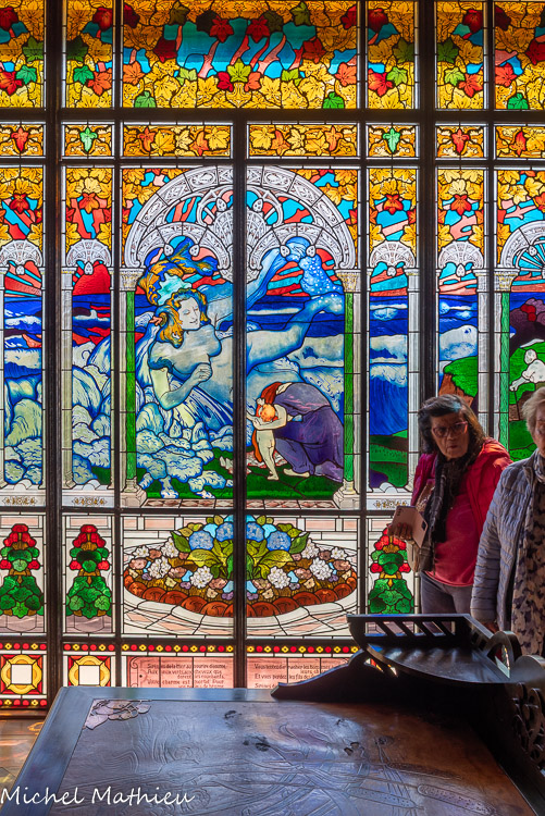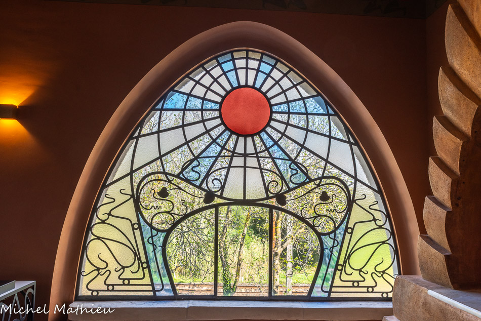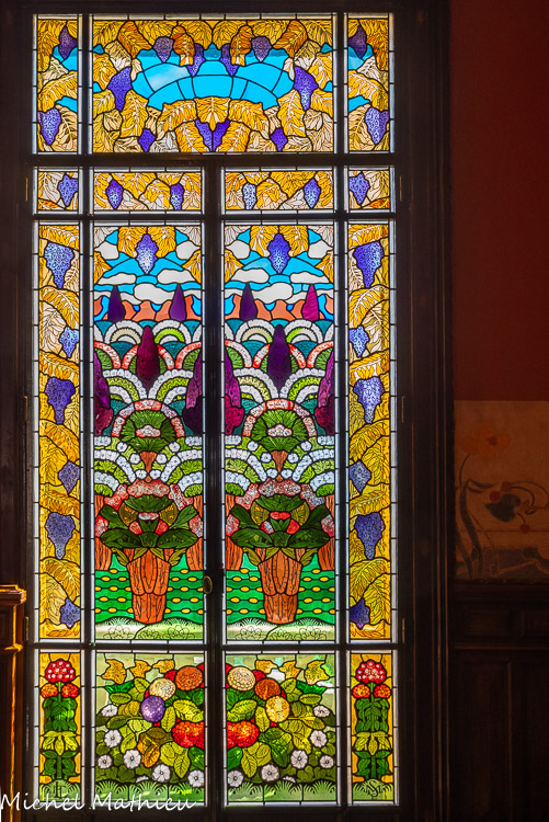 La salon-cabinet de travail. Vitrail Les Cyprès, d'E. M. Simas et T. Laumonnerie, vraisemblablement postérieur de deux années environ à la grande verrière, soit 1898-1899, date de l’aménagement de l’appartement.