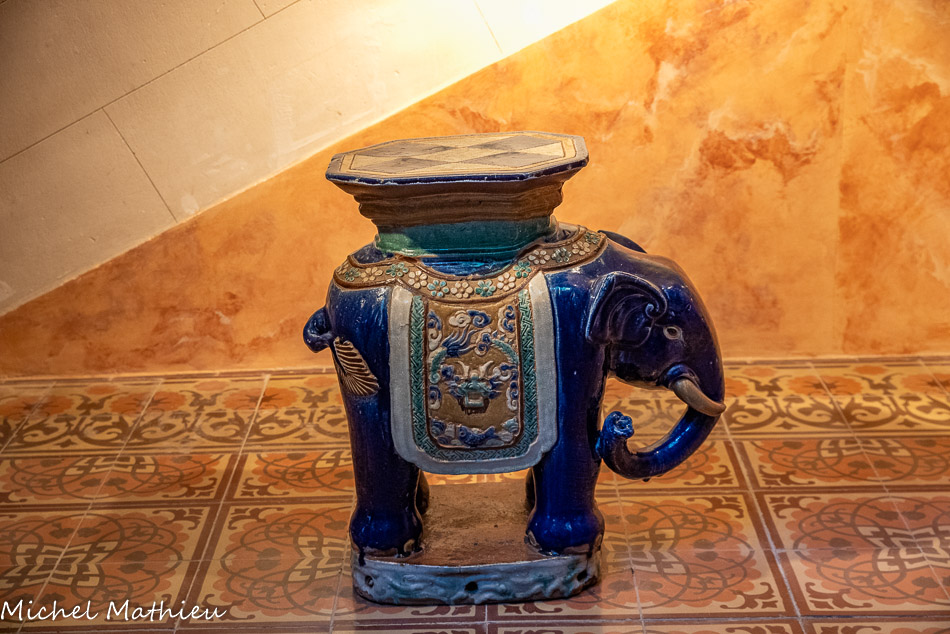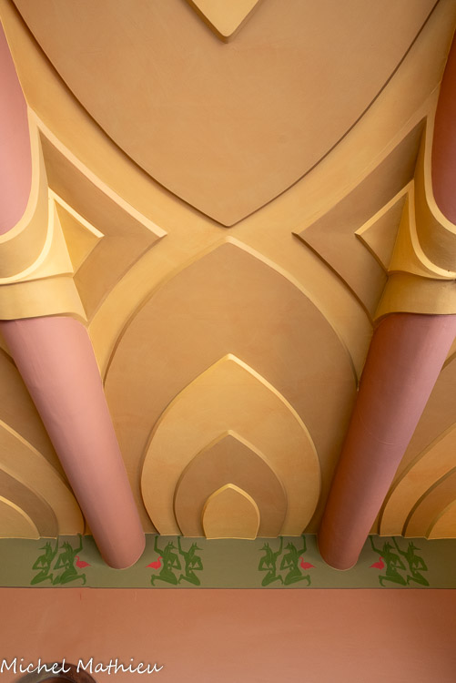 L’une des pièces les plus marquantes est l’auditorium (ou salon de musique), surmonté d’un dôme elliptique de 20 mètres de haut. Le plafond doré est orné de motifs d’ocelles de plumes de paons, alternant avec de larges fleurs de lotus roses et blanches. Le motif du plumage de paon était apprécié par les artistes de l’Art nouveau. En revanche, la combinaison des motifs de l’ocelle de plume de paon et de la fleur de lotus rappelle le décor du palais Chandra Mahal, à Jaipur, probablement visité par Laurens.