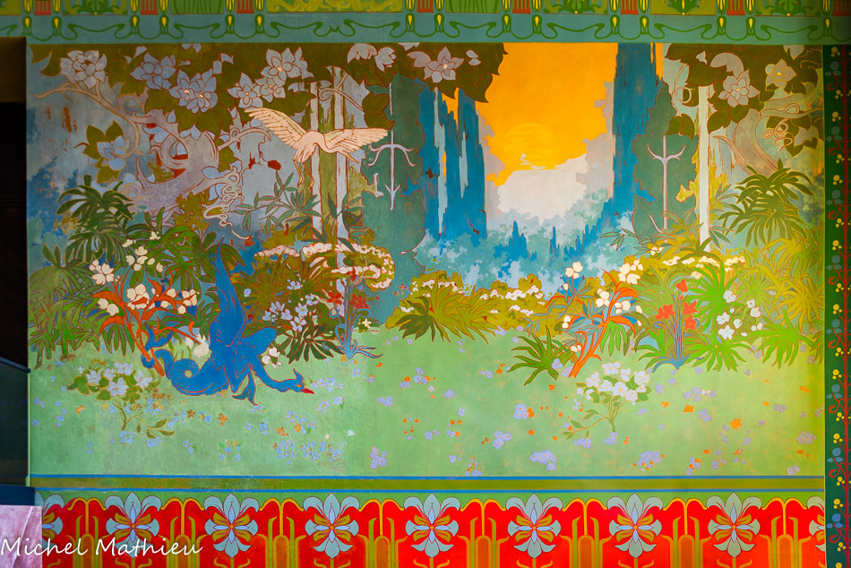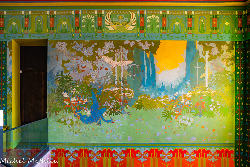 laboratoire du premier étage. L'ancien décor évoquait un cérémonial de danse et de musique, sorte d’initiation magique où l’art, exprimant des rêveries symbolistes inspirées de Jan Toorop (1858-1928) et de Maurice Denis (1870-1963), est appelé à transformer la vie. On attribue ce décor, ou du moins les peintures murales, probablement à Eugène Dufour qui exécuta celles des salles de réception. En témoignent les techniques utilisées, le poncif notamment, le style quelque peu composite et le traitement des figures et des motifs résolument tournés vers un orient de fantaisie, en accord avec le décor général de la villa. Si l’on peut le situer dans les avant-gardes picturales de la fin du XIXe siècle, l’absence de documentation sur le programme iconographique et l’état critique de onservation du cycle des onze toiles composant l’essentiel du décor mural (disparition à plus de 80% de la couche picturale) ont rendu impossible sa