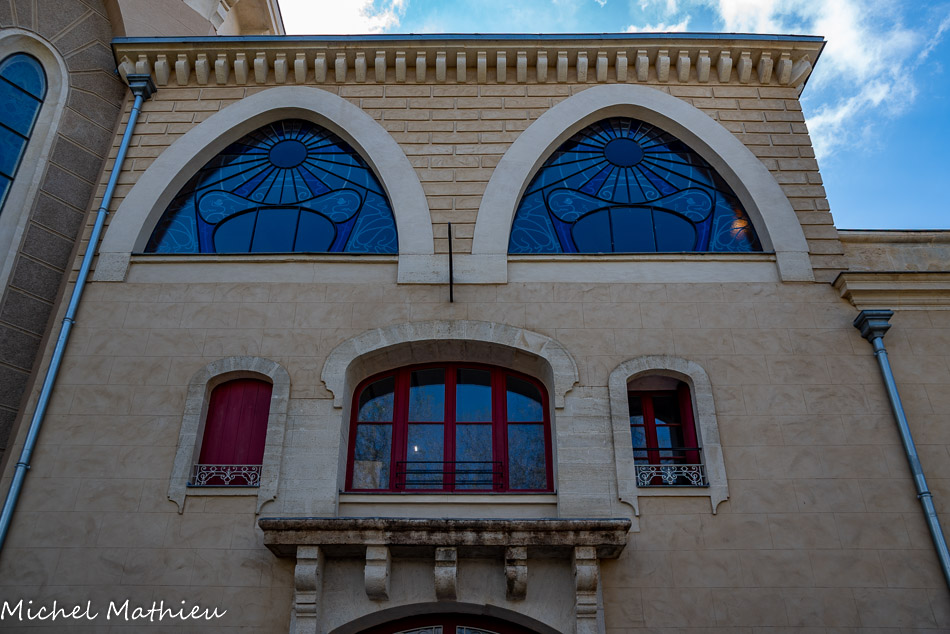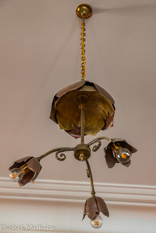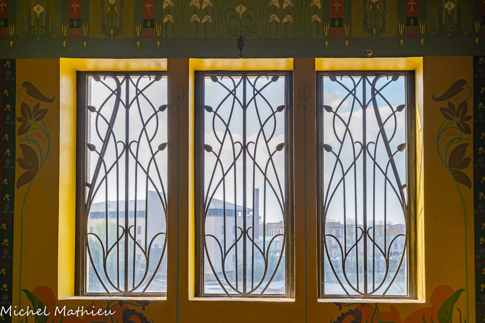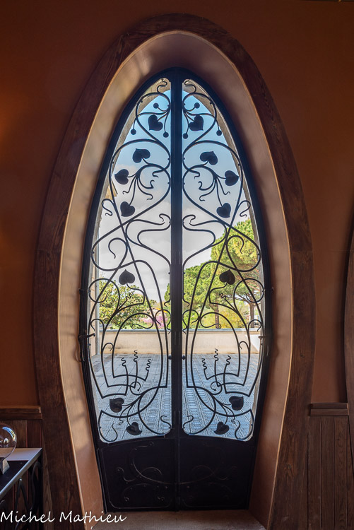 La porte entre le petit et le grand vestibules. En ce qui concerne les matériaux utilisés, là aussi Emmanuel Laurens a su faire preuve de modernité en utilisant du béton armé, un matériau très peu connu à cette époque-là. Le château fut également, une des premières demeures à être équipée du chauffage central et de l’électricité. Cette porte, influencée par celle de la chemiserie Niguet de Paul Hankar, révèle de manière inédite d’une part, l’importance du rôle des revues parisiennes dans la diffusion en province de nouvelles formes décoratives et d’autre part l’engagement des territoires dans ce renouveau des arts décoratifs sur l’exemple accompli de l’École de Nancy. Dans le Midi de la France, il s’exprime par l’ouverture de départements de décoration moderne (mobilier, tissu, objet d’art) au sein des magasins d’ameublement traditionnel comme Paul Arnavielhe, futur Président de la chambre de commerce de l’Hérault, le fit à Montpellier en s’entourant de « collaborateurs artistes ».