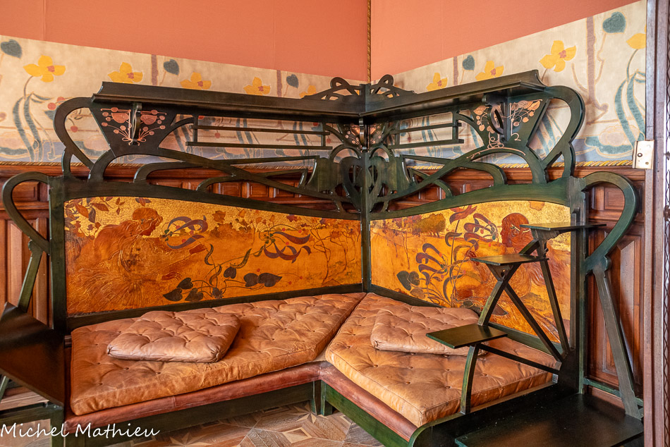 La salon-cabinet de travail. La banquette d'angle en cuir, à dossier sculpté et ajouré, ornements dans le style Art Nouveau de Léon Cauvy.