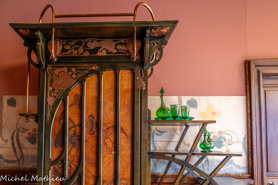 La chambre de sa soeur, Marguerite Laurens. La duchesse brisée et la grande armoire avec miroir sur une des portes, et une jeune fille cueillant des fleurs sur l'autre, sont signées Cauvy Léon (peintre) et Arnavielhe Paul (menuisier). Entre Art nouveau et goût oriental, ce mobilier en bois, en métal martelé et en parchemins japonisants, révélait le prestige du lieu.