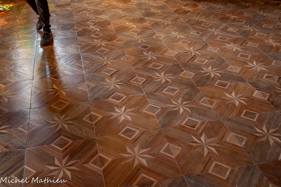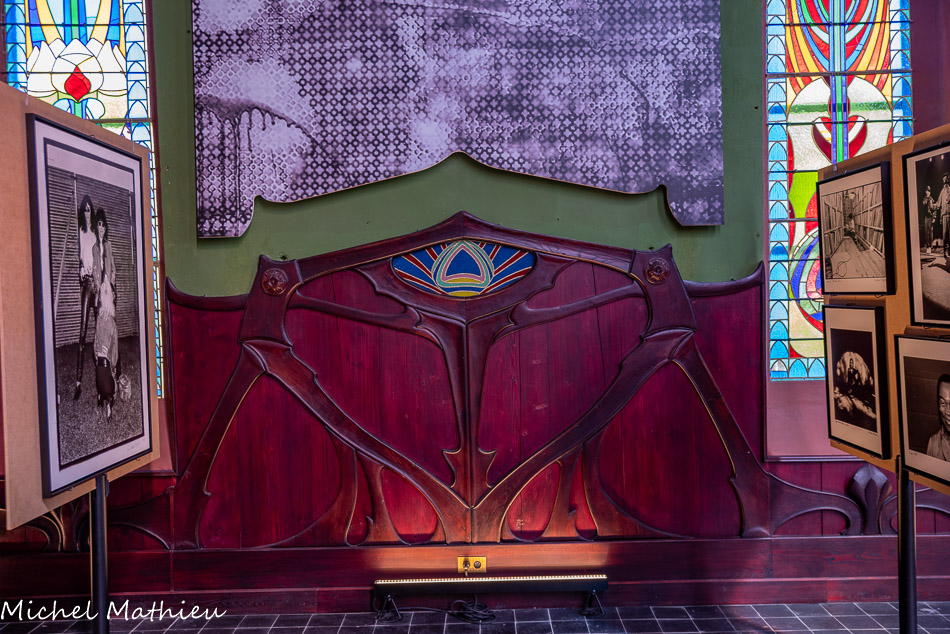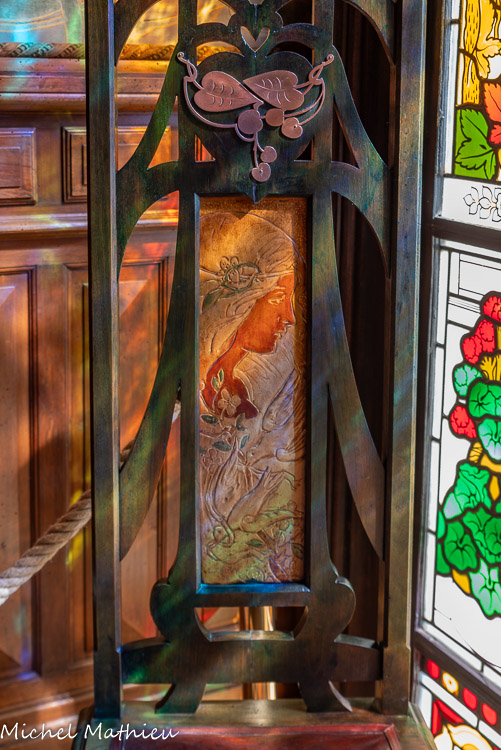 Les parties basses sont ornées de hauts lambris, rehaussés de larges découpes de bois décoratives et percés au sommet d’une ouverture recevant un simple verre peint.