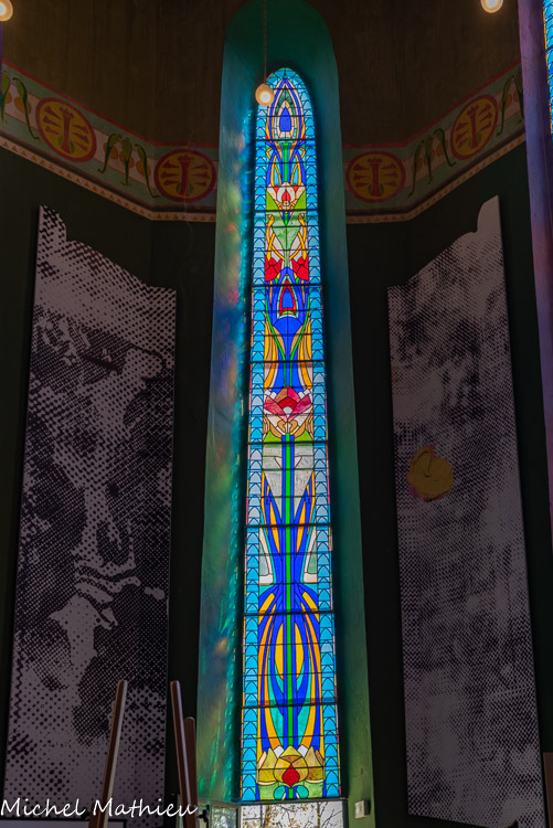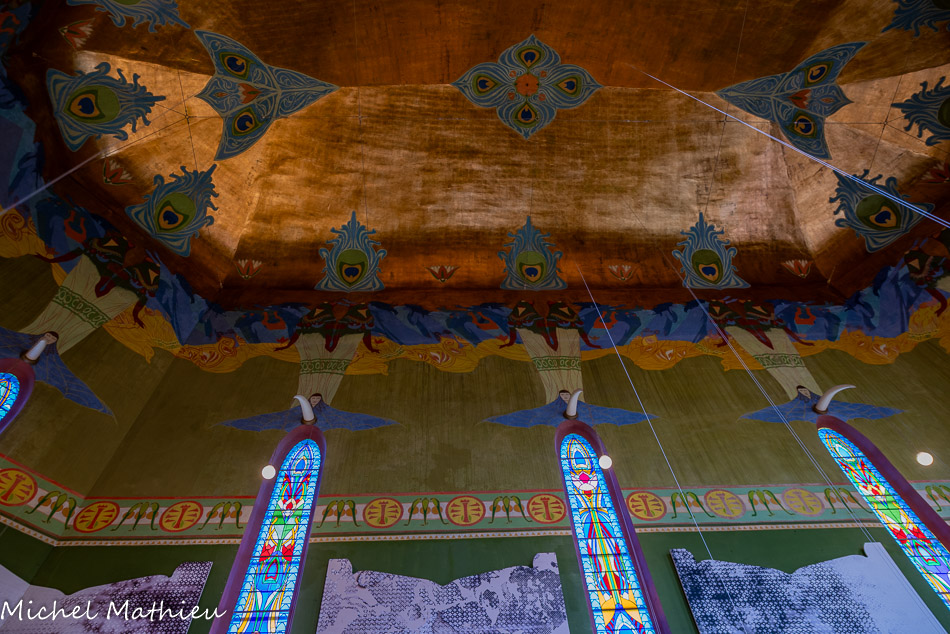 Au dessus, de grandes toiles (H. 5,20 ; L. 3,50), couronnées par une frise murale à motifs de cobras, alternent avec les vitraux des baies qui évoquent des plumes de pans multicolores. Cette frise comprend une frise de triangles jaunes ; au-dessus, sont peints des groupes de trois cobras lovés sur leur queue, deux de profil et un de face ; des disques solaires sont disposés derrière eux. Il s’agit d’une évocation très libre du motif égyptien de l’uræus, dans la mesure où le disque solaire n’est jamais figuré si petit, ni placé derrière le plastron du cobra, en Égypte, et jamais leurs gueules ne convergent les unes vers les autres, lorsqu’ils sont représentés en dyades, triades ou frises. Le motif central, inclus dans un médaillon, paraît une réminiscence du pilier djed.
