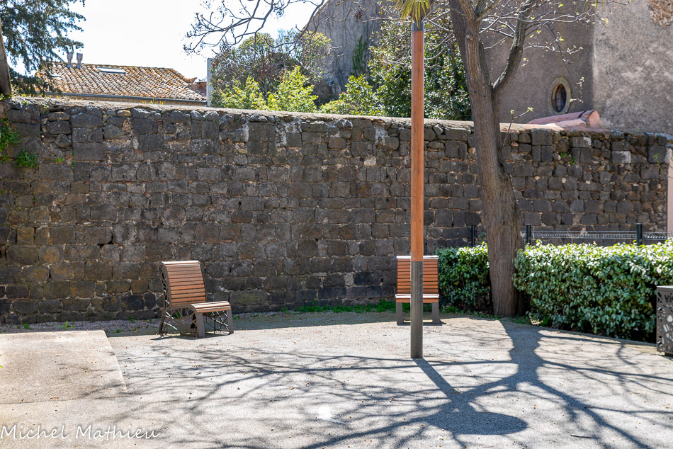 Non signée, la statue en marbre blanc figure un personnage féminin debout et entièrement voilé, croisant ses mains sur sa poitrine, et s'inspirant fortement de la sculpture médiévale allemande dite ""belle madone de Nuremberg"" dont plusieurs copies ou modèles ont été diffusés au 19e siècle (en particulier un buste aujourd'hui conservé au Louvre). Documentée par une photographie ancienne en noir et blanc, la sculpture a probablement été commandée par Emmanuel Laurens pour orner son bureau en complément des autres meubles, et avait été remisée depuis plusieurs décennies dans une caisse en bois, avant d'être réinstallée en 2022 avec son piédestal d'origine en pierre. A droite, le tabouret à deux pieds appuyé contre la partie à grand vantail de l'armoire..