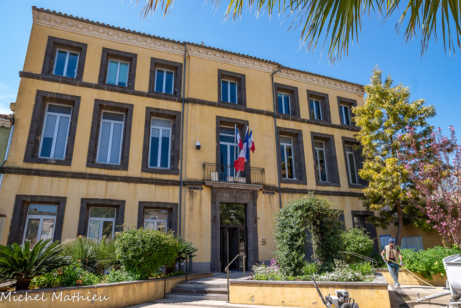 Place du 14 juillet. Les halles. Il est probable qu'il y ait eu au même emplacement un marché couvert dès l'époque médiévale. La halle a été reconstruite entre 1828 et 1830 à l'initiative du maire, François Rascas de Palignan. La date est inscrite sur la pierre formant clé de voute d’un des arcs. Les huit ouvertures sont constituées de piliers qui portent des arcs de plein cintre. Le blason de la ville est placé sur le mur au sud. Orné de fleurs de lys bleues, il représente le symbole de l’autorité royale sur le village. C'est lors de cette campagne de travaux qu'a été rajoutée la partie arrondie qui ne figure pas sur le cadastre napoléonien, selon le plan dressé par un architecte agathois nommé Nègre.