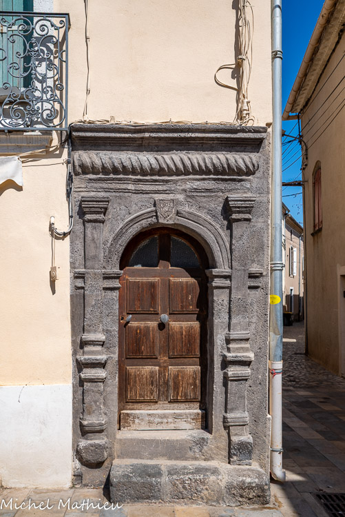 Place du 14 juillet. Les rues de Vias abritent un nombre important de très belles portes sculptées du début du XVIIème siècle. Ces portes taillées dans la roche volcanique, le basalte, se caractérisent par l'harmonie de leurs proportions et l'absence de fioritures. Une sobriété sans doute en partie due à la dureté du matériau utilisé. Leur décor de pilastres, d'entablement torique, leurs clefs ornées de motifs végétaux rappellent les portes gravées par le célèbre architecte Sébastien Serlio. Les maçons locaux n'ont pas imité les modèles du maître, mais ont pulsé dans ses recueils divers éléments qu'ils ont juxtaposés pour créer leurs propres ouvrages. Porte dite serlienne. Dans l'angle de la place, près de la fontaine, s'ouvre une porte piétonne : deux pilastres surmontés de chapiteaux doriques encadrent une baie en plein cintre. Ils supportent un entablement sur lequel court une frise, sorte de bandeau arrondi où s'enroule en spirale un