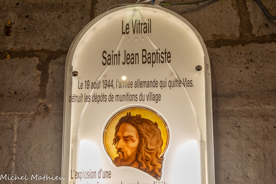 Le 19 août 1944, l’armée allemande qui quitte Vias détruit les dépôts de munitions du village. L’explosion d'une violence inouïe cause de nombreux dégâts. Des bâtiments sont détruits ou endommagés, les tombeaux du cimetière communal sont éventrés. En cet instant, Melle Marie Loppez, se souciant peu de ses dégâts personnels, se précipite à l'église Saint Jean Baptiste, le souffle de la tempête est passé par ici également, et le spectacle à l’intérieur de l’édifice rligieux est une véritable désolation. Les magnifiques vitraux sont brisés en mille morceaux. Tous sauf un, miraculeusement conservé qui représente le visage de Saint Jean Baptiste patron et protecteur de Vias. Melle Marie Loppez emporte cette relique avec elle et la conserve secrètement. Avant sa mort, elle la confiera toutefois à sa nièce, Melle Cécile Etienne avec pour mission de la restituer aux autorités locales à l’occasion de travaux de réhabilitation de l’église. C'est ainsi que ce fragment du vitrail original a pu retrouver sa place au sein de l'église Saint-Jean-Baptiste