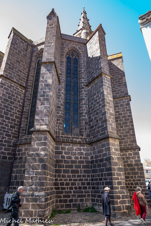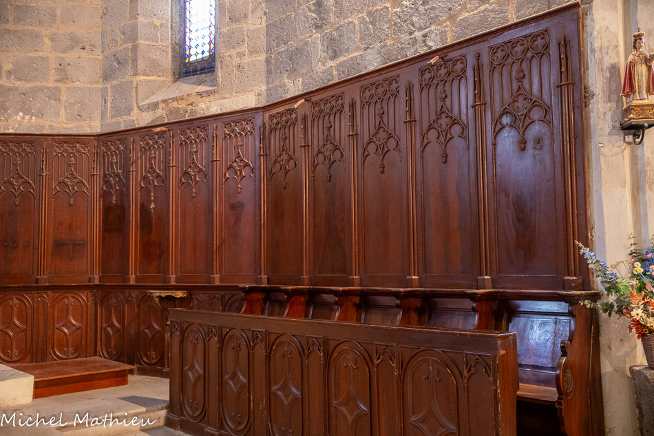 À l’intérieur, le transept est bien marqué, formant deux chapelles. Le chœur est doté de hautes fenêtres géminées et d'arcatures de voûtes. Le chevet à 7 pans, est voûté d’ogives. Quelques têtes sculptées terminent les branches d'ogives du chœuL'église a été construite au XIIe s., et reconstruite au XIVe s., en pierre volcanique. Son style s'apparente au style de transition qui marque la naissance et l'expérimentation du style gothique : l'arc brisé permettant aux murs de gagner de la hauteur, la voûte sur croisée d'ogive qui permet d'élargir les édifices et les contreforts pour soutenir les murs.