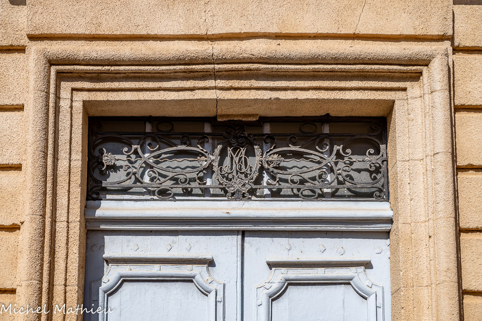 ruban. Une clé décorée d'un écusson timbre le haut de l'arcade. Sur cette clé, se lit l'inscription suivante : G. M. 1603 où lettres et chiffres sont en plomb rapporté. Il faut souligner les particularités des pilastres : dotés de très hauts piédestaux qui les rattachent à la Renaissance, ils coupent les moulures qui soulignent les impostes de l'arc de la porte.