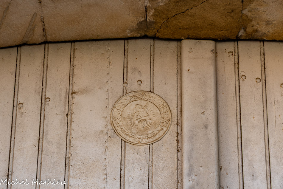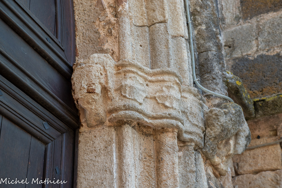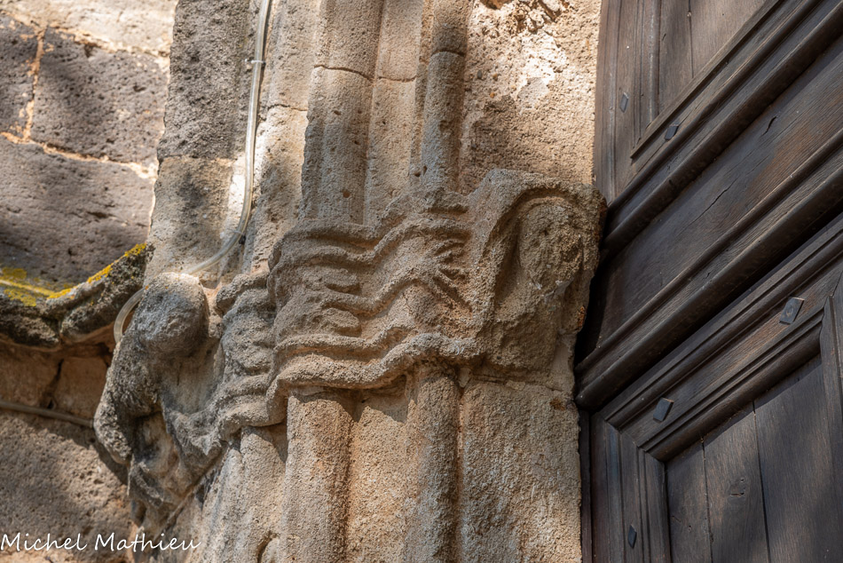 L'imposte des piédroits est sculptée de chaque côté de la porte d'une tête humaine, de chapiteaux feuillagés et d'un animal fantastique, tous très érodés.